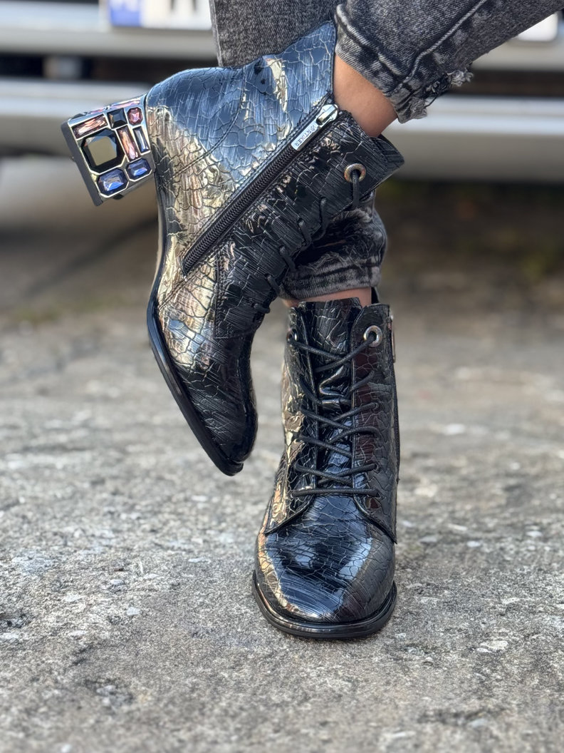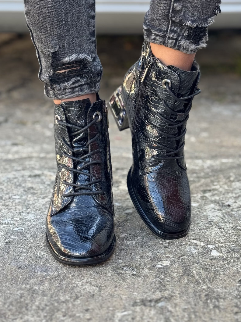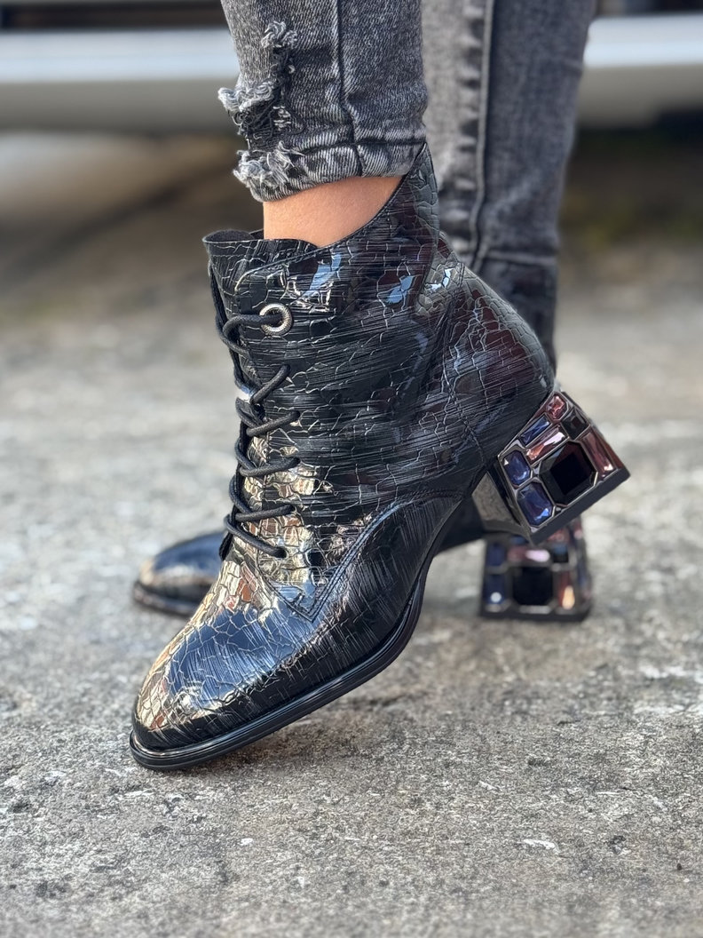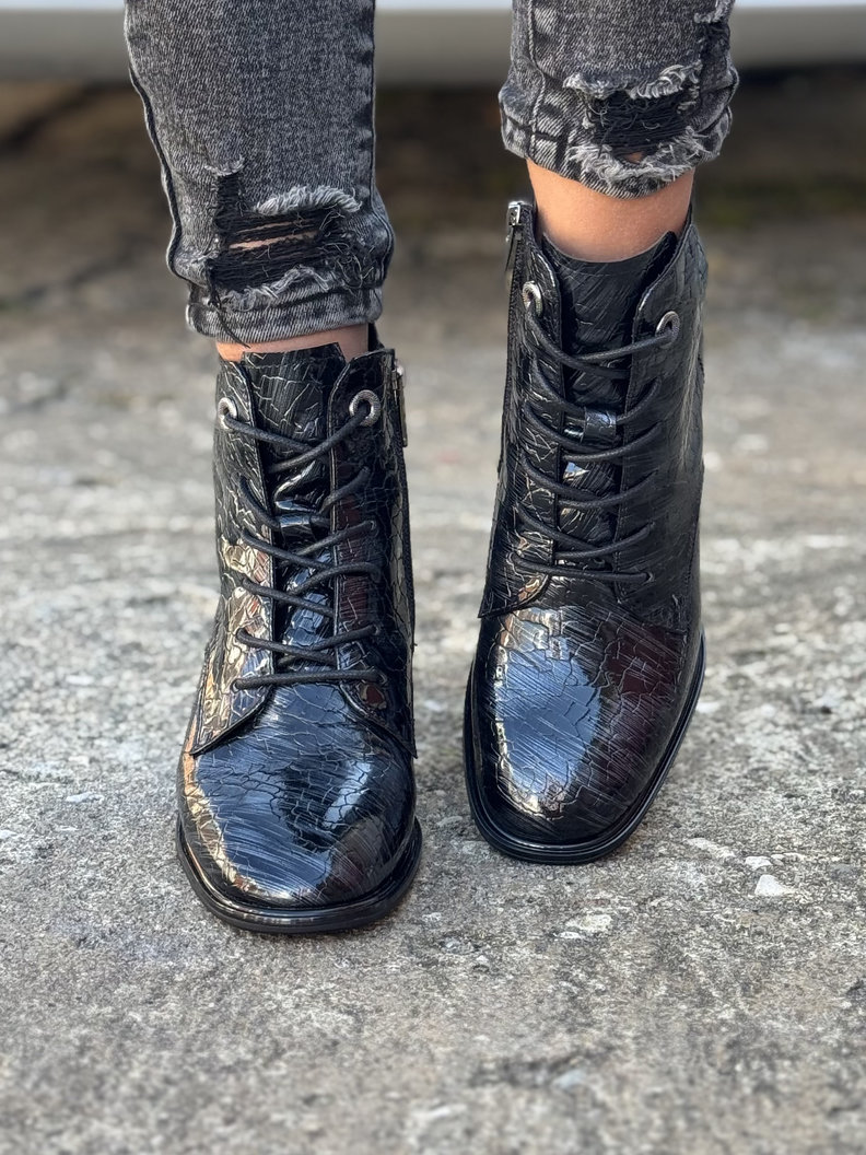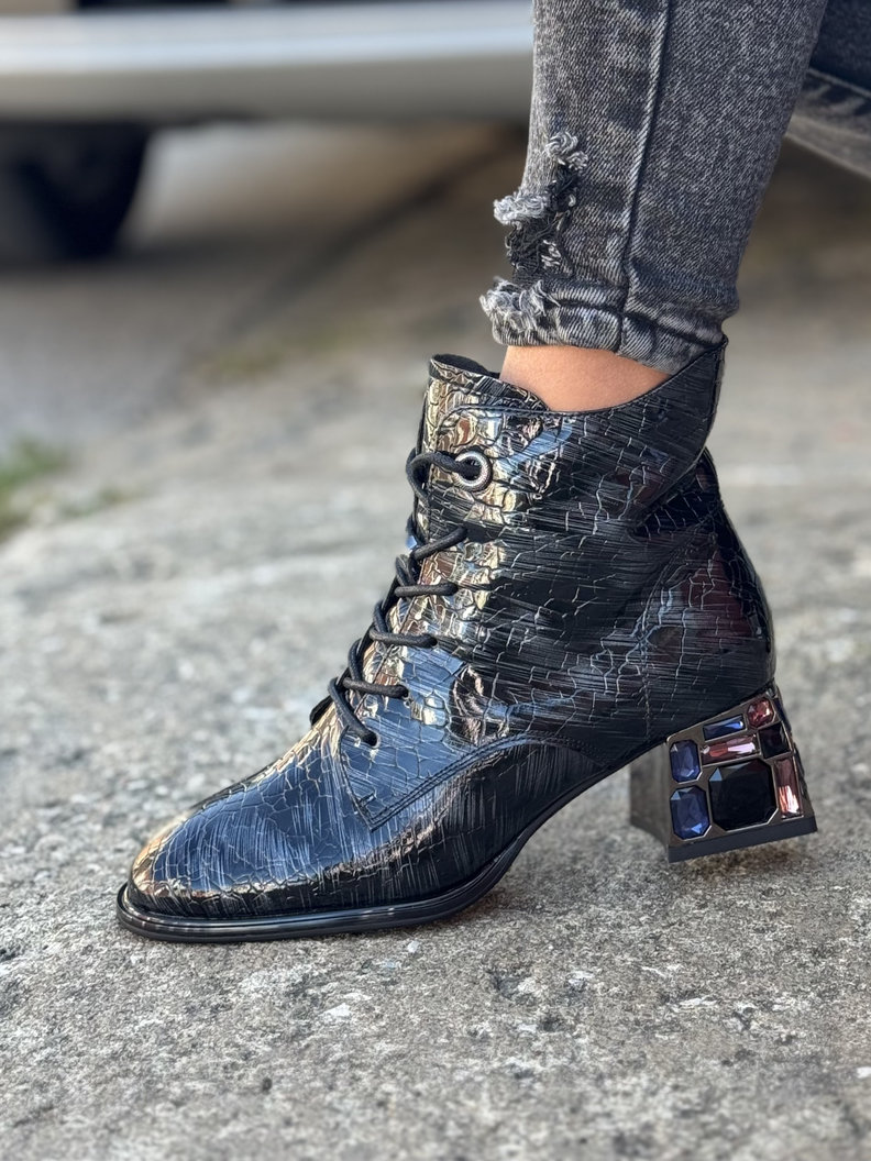 Lakierowane botki wykonane z naturalnej skóry o unikalnej, fakturowanej powierzchni i subtelnym, błyszczącym wykończeniu. Materiał odbija światło, nadając butom eleganckiego i luksusowego charakteru. Obcas o wysokości 5 cm zdobiony trwałymi kamieniami, które nadają modelowi wyjątkowego charakteru. Sznurowanie pozwala na precyzyjne dopasowanie do stopy, a boczny zamek ułatwia szybkie zakładanie i zdejmowanie. Wnętrze buta wykończone jest delikatnym, lekko grubszym flauszem, który subtelnie ociepla stopę i zapewnia komfort noszenia