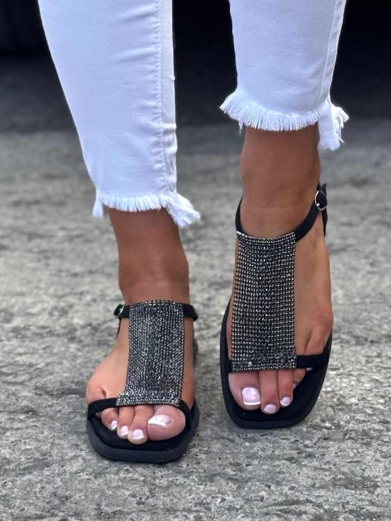 Stylowe sandałki na płaskiej podeszwie wykonane z miękkiego eko zamszu. Przód zdobi elegancki pas z drobnych cyrkonii, który subtelnie przyciąga wzrok. Kobiece, wygodne i bardzo uniwersalne – świetnie sprawdzą się do letnich sukienek, spódnic czy jeansów. Idealne na co dzień i na wyjątkowe okazje.