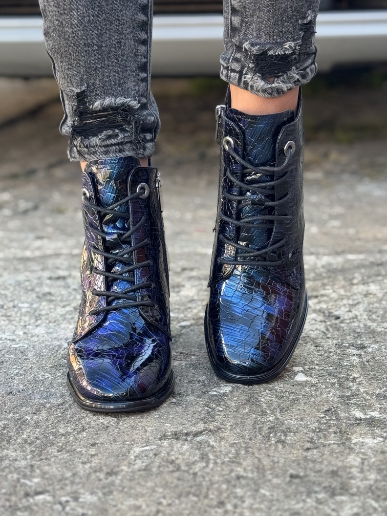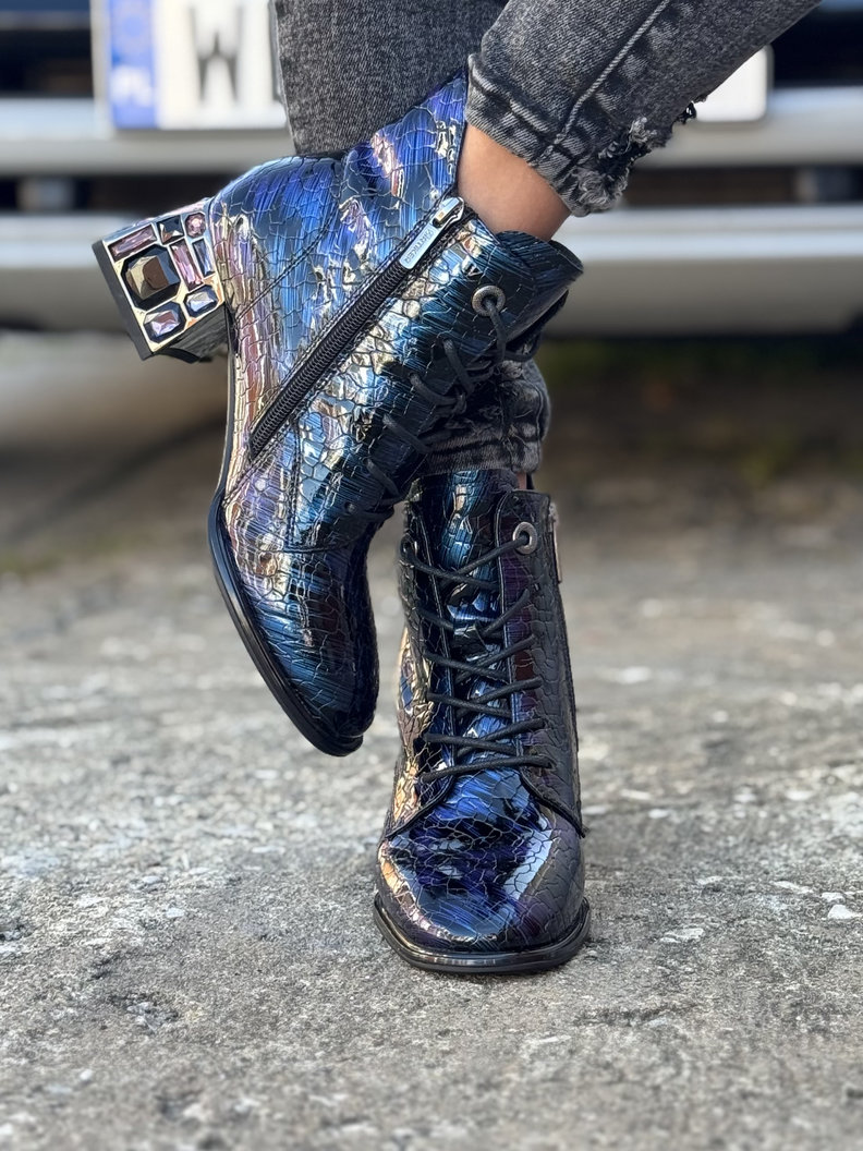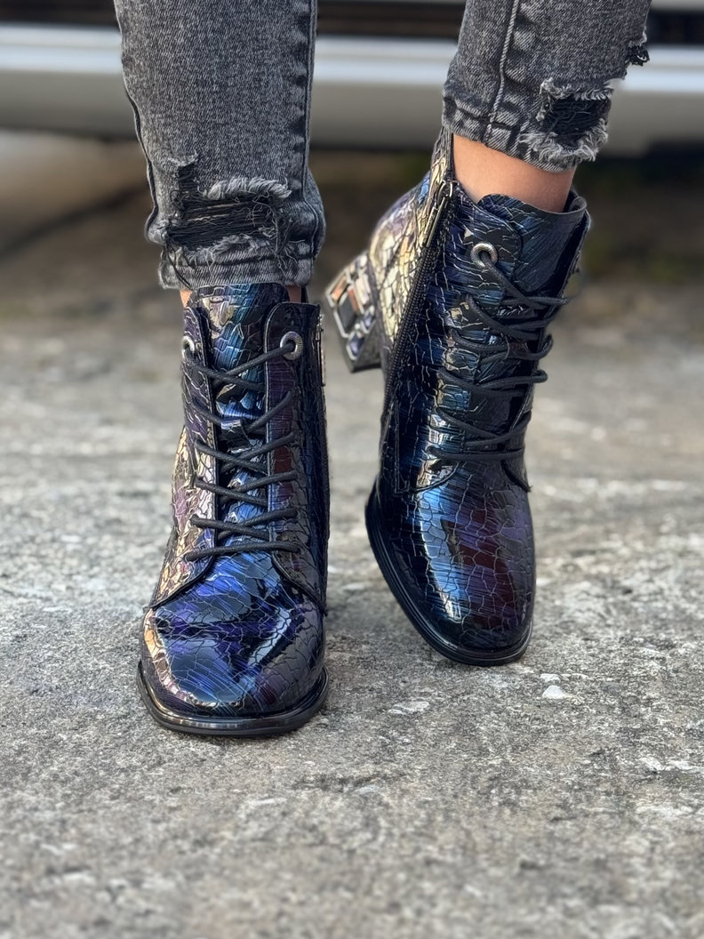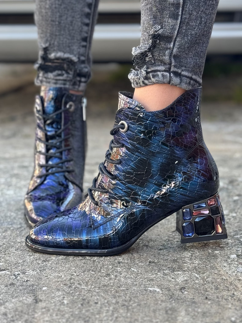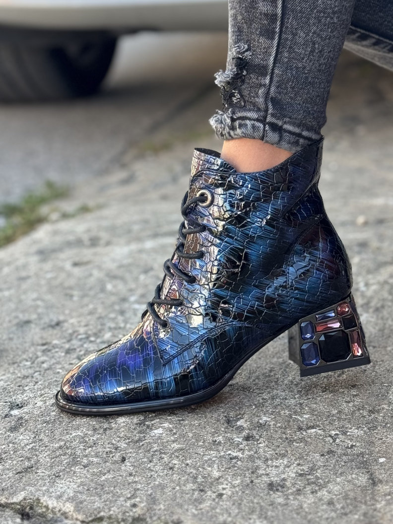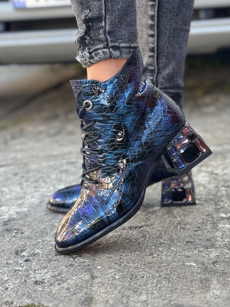 Lakierowane botki wykonane z naturalnej skóry o unikalnej, fakturowanej powierzchni i subtelnym, błyszczącym wykończeniu. Materiał odbija światło, nadając butom eleganckiego i luksusowego charakteru. Obcas o wysokości 5 cm zdobiony trwałymi kamieniami, które nadają modelowi wyjątkowego charakteru. Sznurowanie pozwala na precyzyjne dopasowanie do stopy, a boczny zamek ułatwia szybkie zakładanie i zdejmowanie. Wnętrze buta wykończone jest delikatnym, lekko grubszym flauszem, który subtelnie ociepla stopę i zapewnia komfort noszenia