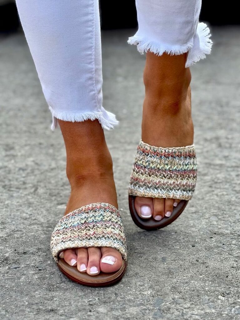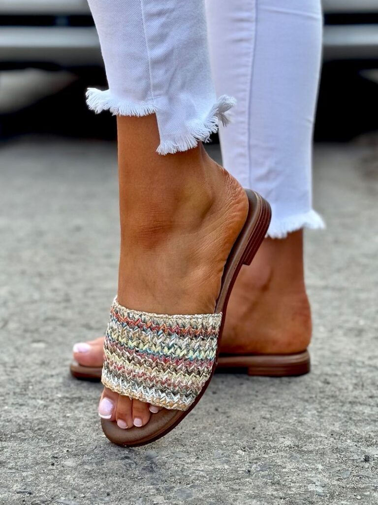Eleganckie klapki KAZADII wykonane z najwyższej jakości polskiej skóry naturalnej, zarówno wewnątrz, jak i na zewnątrz. Na przodzie zdobione modną plecionką w wielokolorowych odcieniach, co nadaje im unikalnego charakteru. Idealne dla kobiet ceniących komfort i najnowsze trendy.