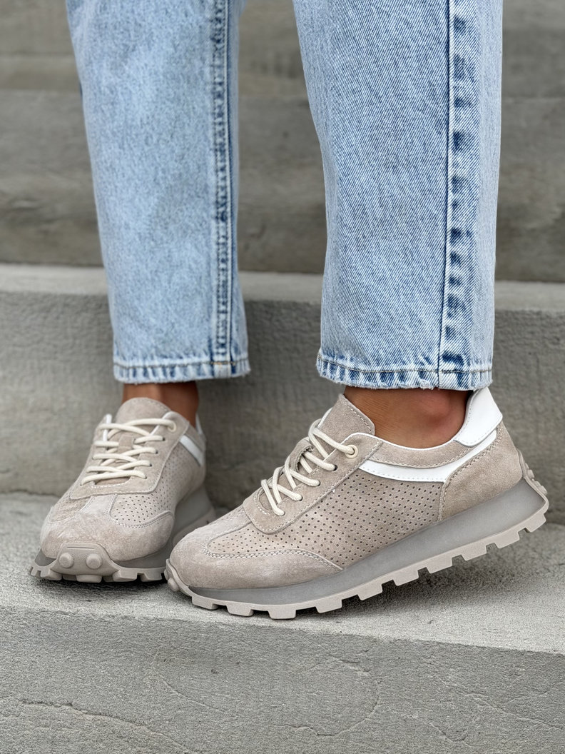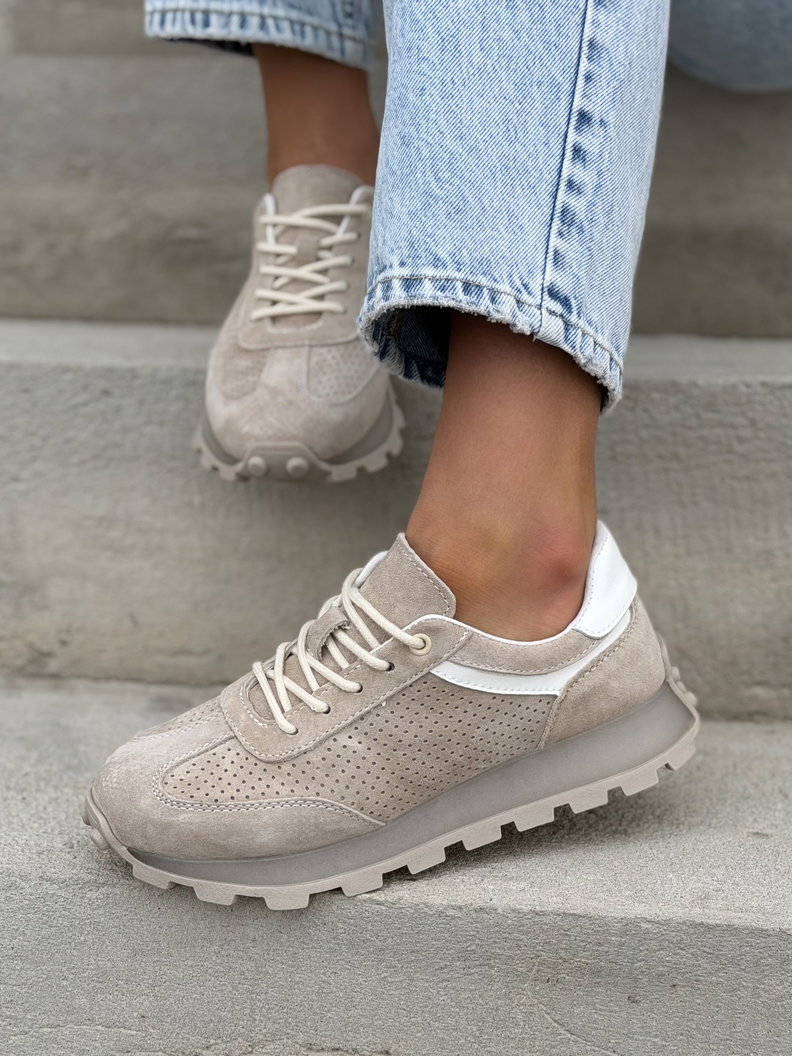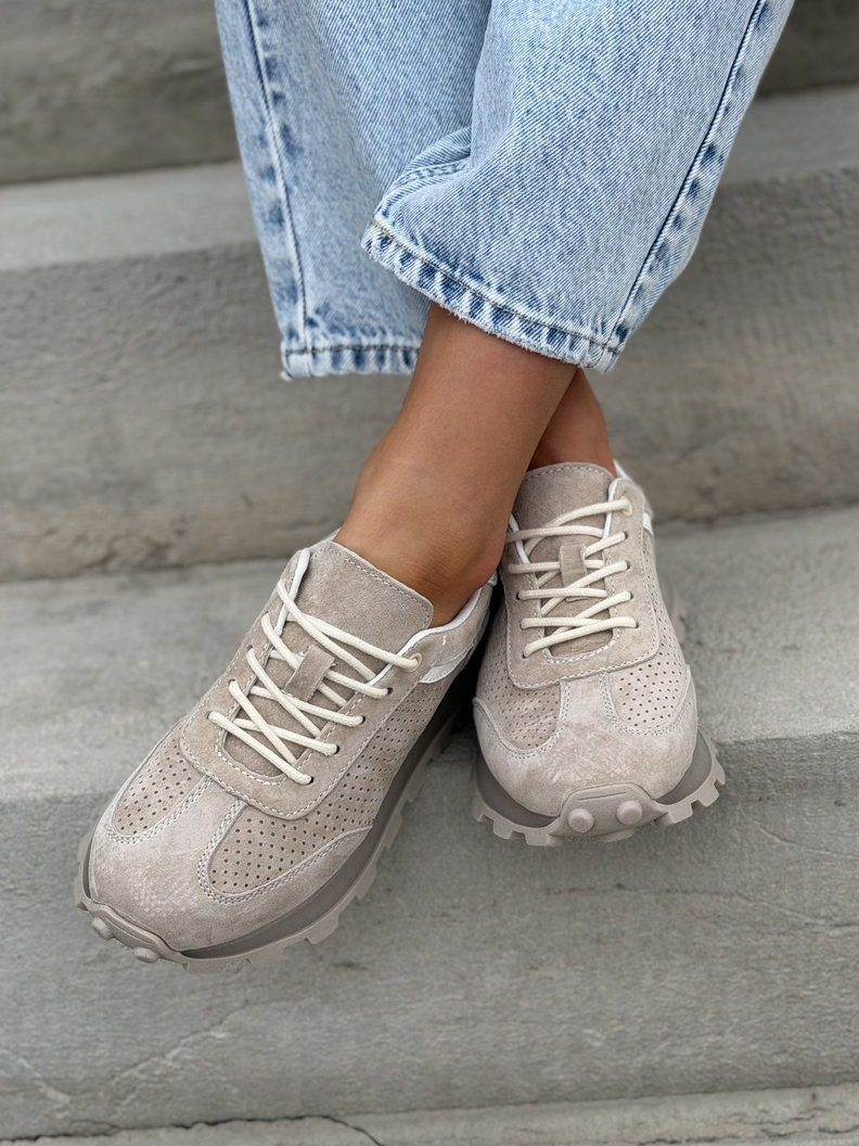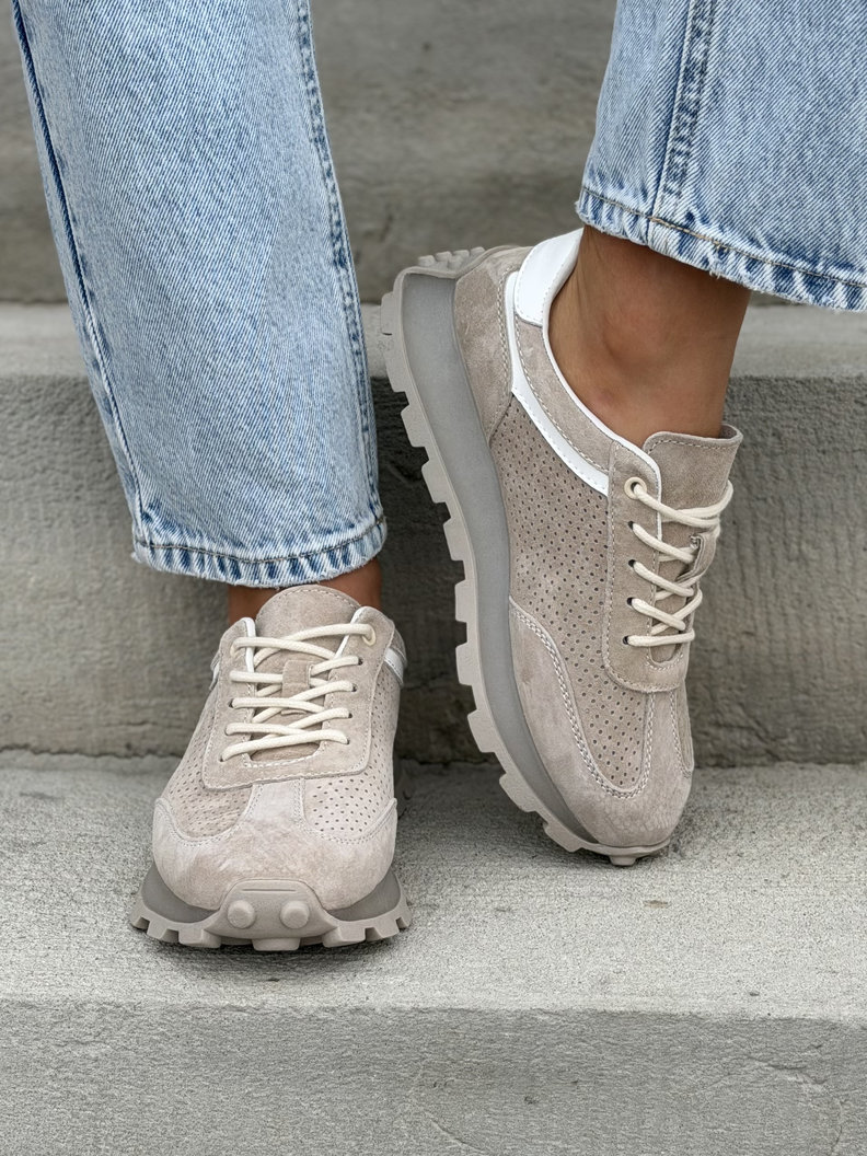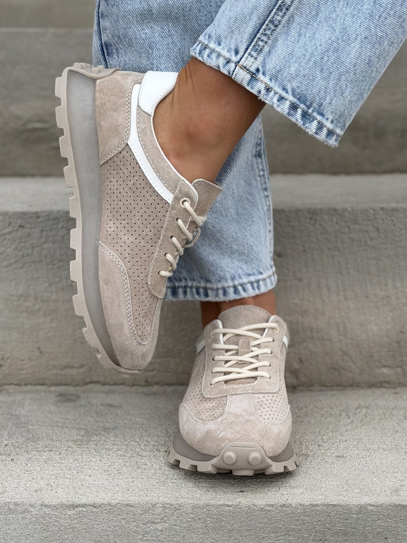 Lekkie sneakersy z naturalnej skóry zamszowej, które pięknie wysmuklają stopę i nadają sylwetce lekkości. Podeszwa 3 cm subtelnie podnosi sylwetkę, a antypoślizgowa konstrukcja zapewnia stabilność i pewność kroku. Mega leciutkie i oddychające, idealne na cały dzień noszenia. Dostępne w uniwersalnym beżu – pasują do jeansów, dresów i codziennych stylizacji