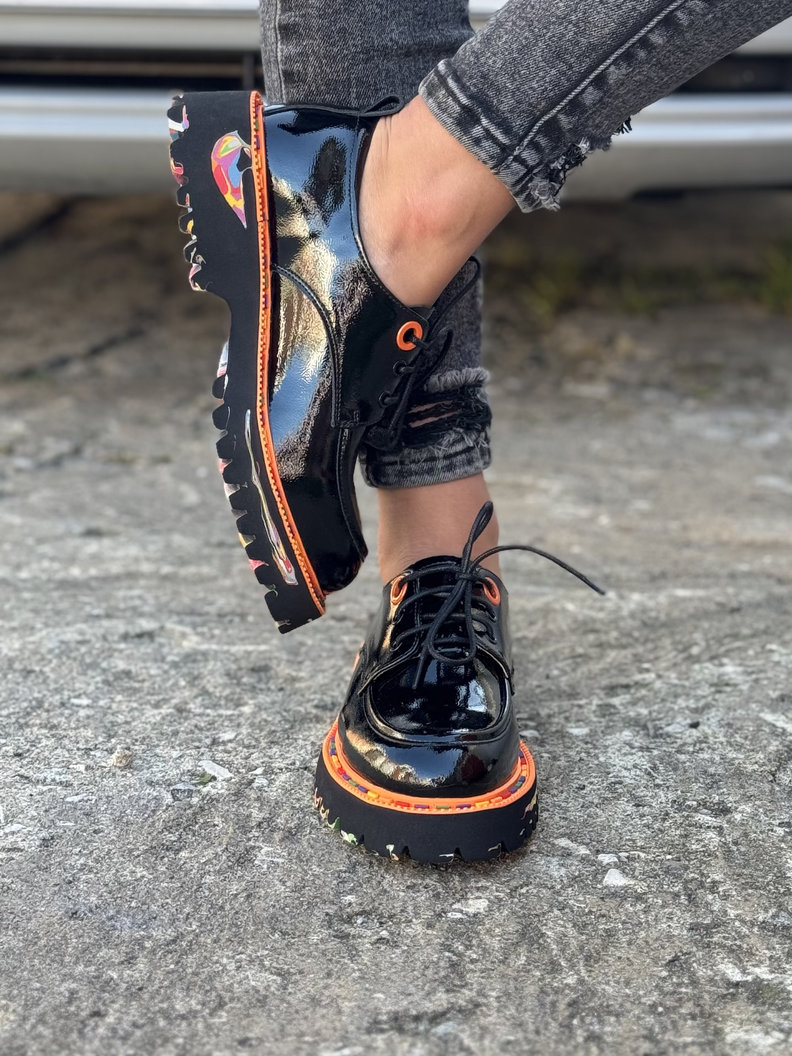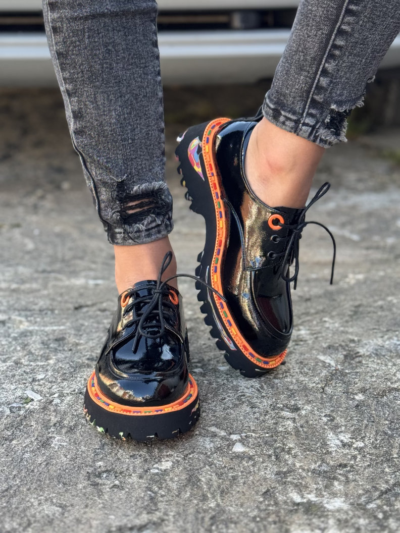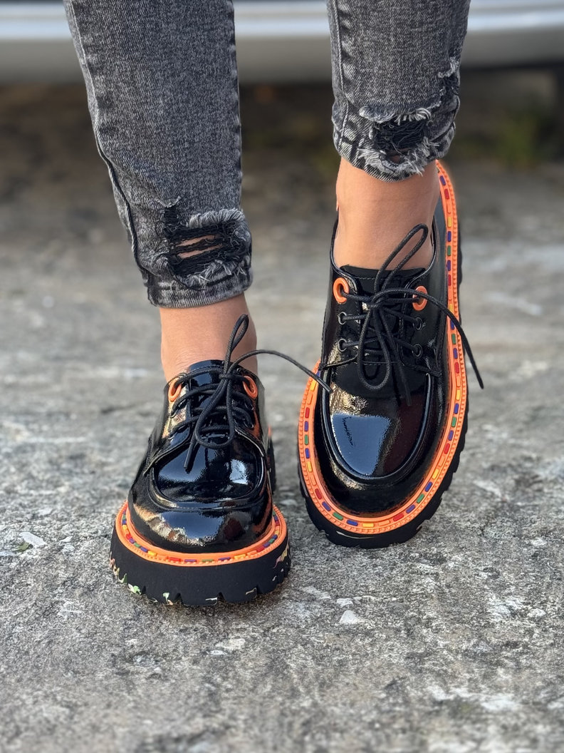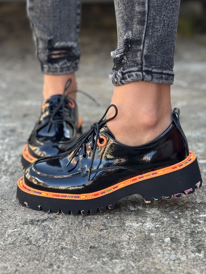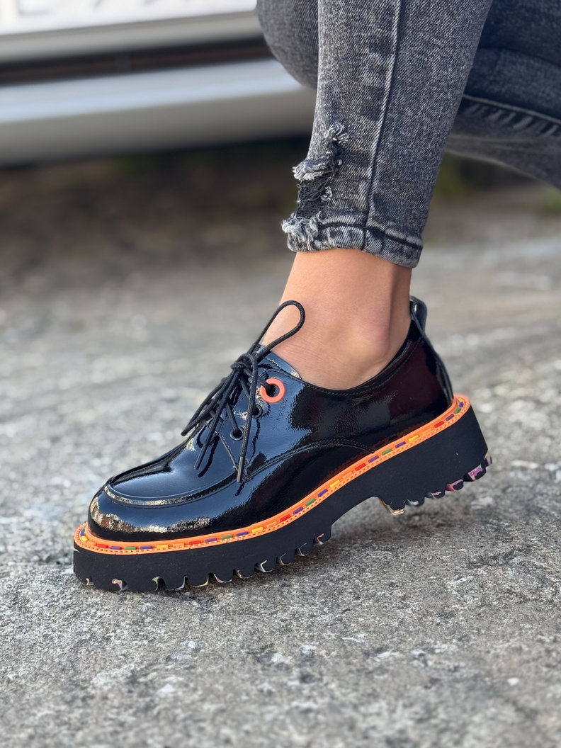 Lakierowane półbuty premium wykonane w całości ze skóry naturalnej – zarówno na zewnątrz, jak i wewnątrz. Klasyczna, sznurowana forma została wzbogacona o kolorową lamówkę na 4-centymetrowej podeszwie, która dodaje butom nowoczesnego charakteru. Są zaskakująco lekkie i niezwykle komfortowe w noszeniu, a antypoślizgowa podeszwa traperkowa zapewnia stabilność i bezpieczeństwo na każdym kroku.