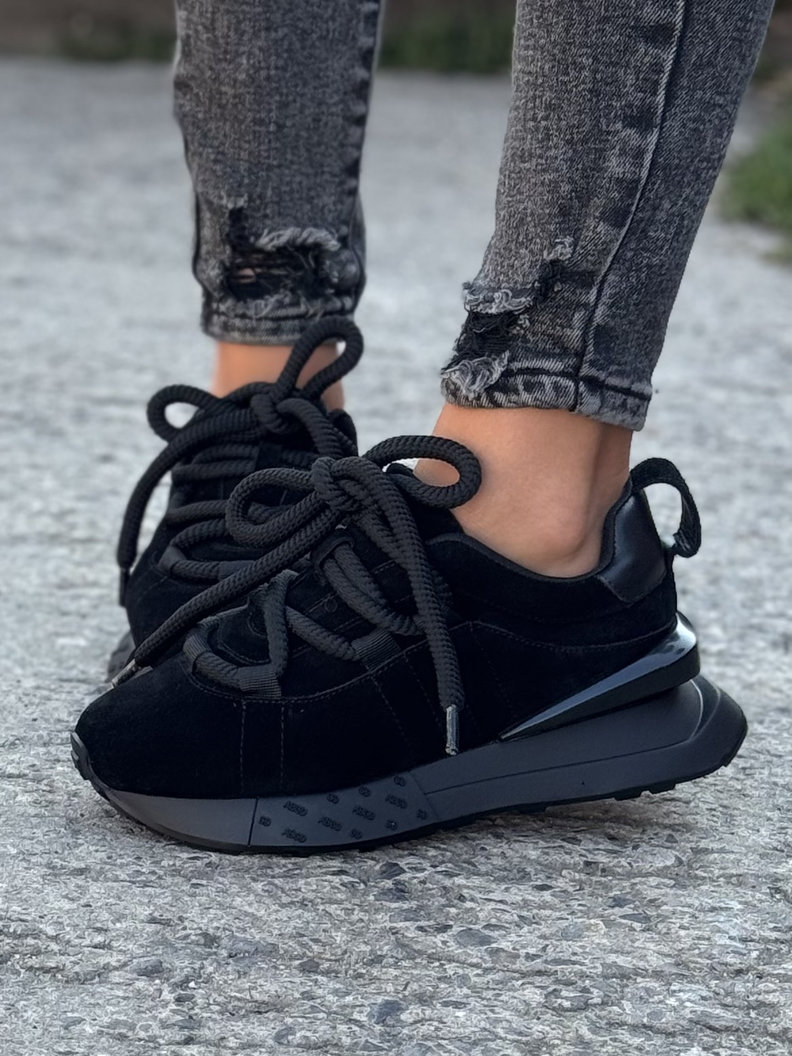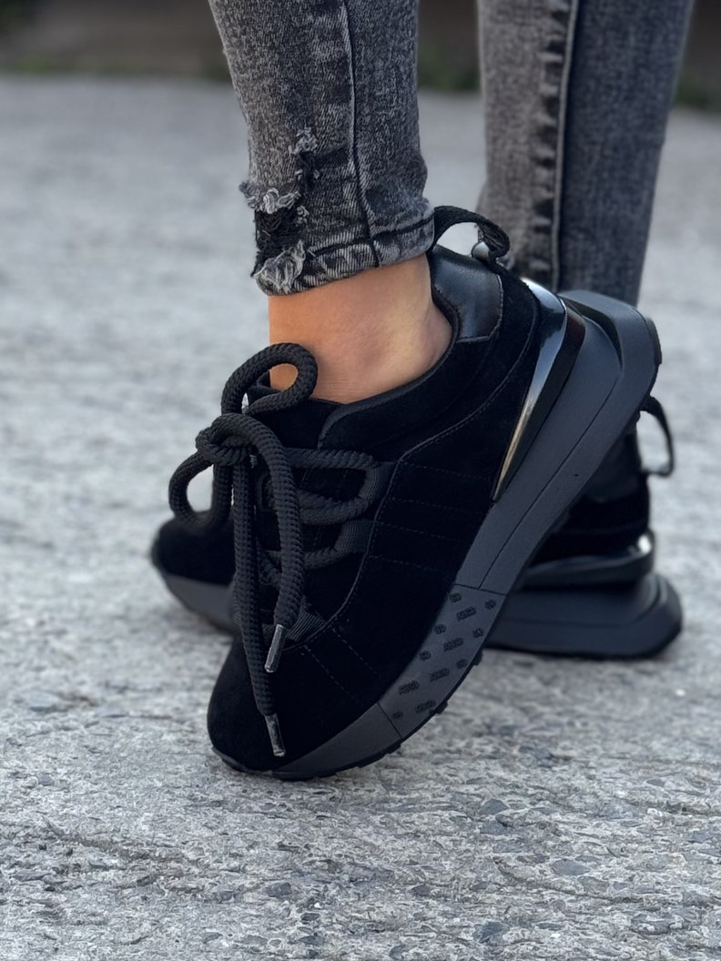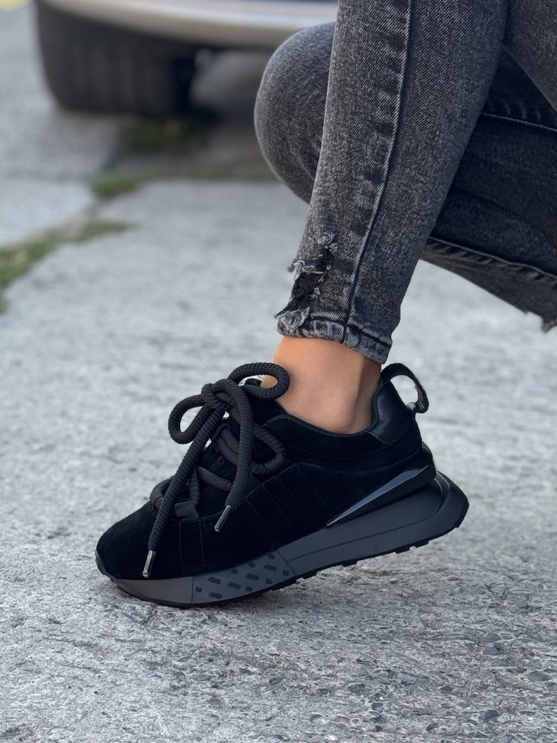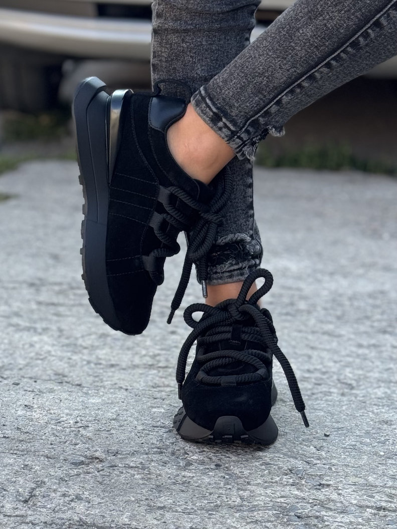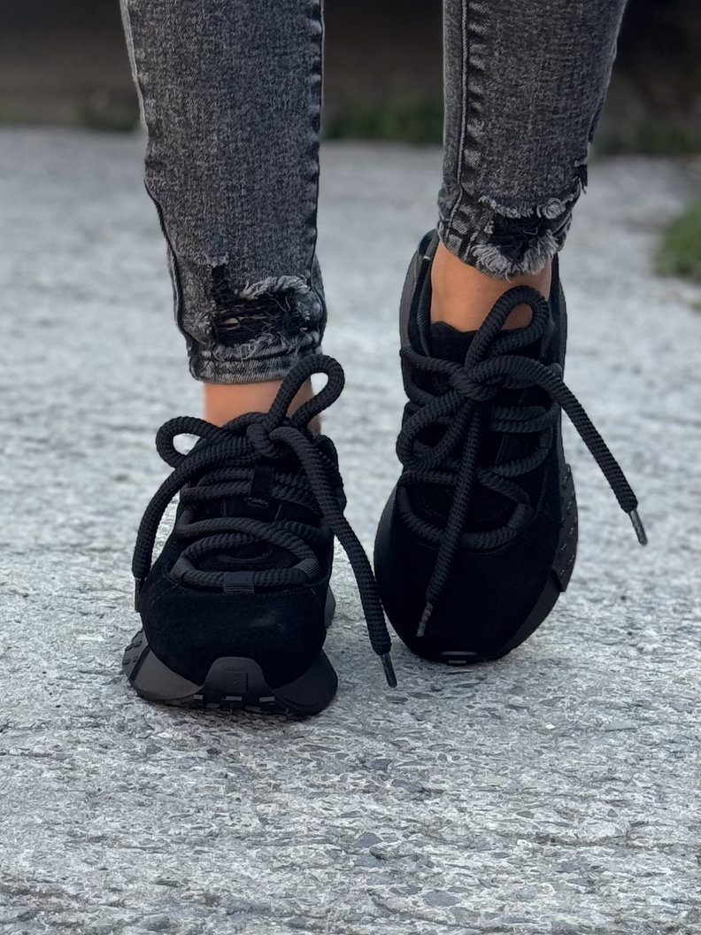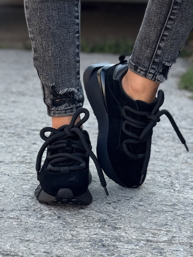 Czarne sneakersy damskie ze skóry naturalnej. Sznurowane, na wyższej podeszwie 3,5 cm – lekka, stabilna i wysmuklająca sylwetkę. Wygodne i efektowne, idealne na co dzień i wyjścia.