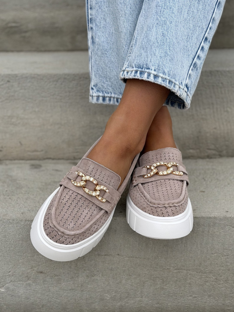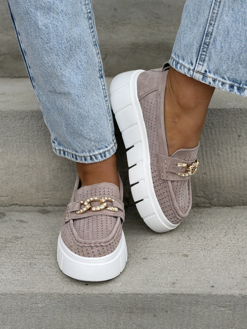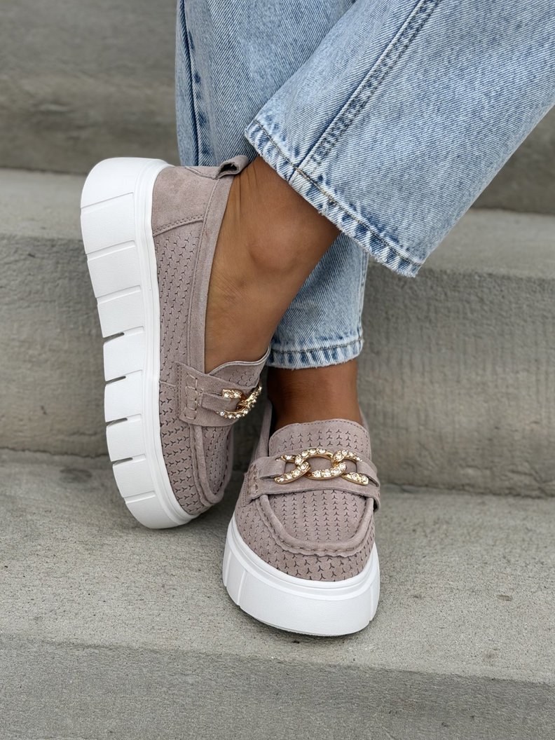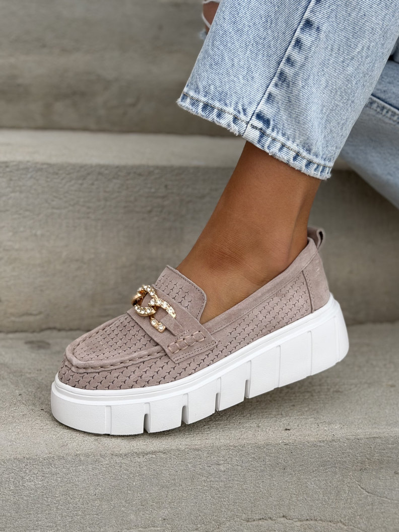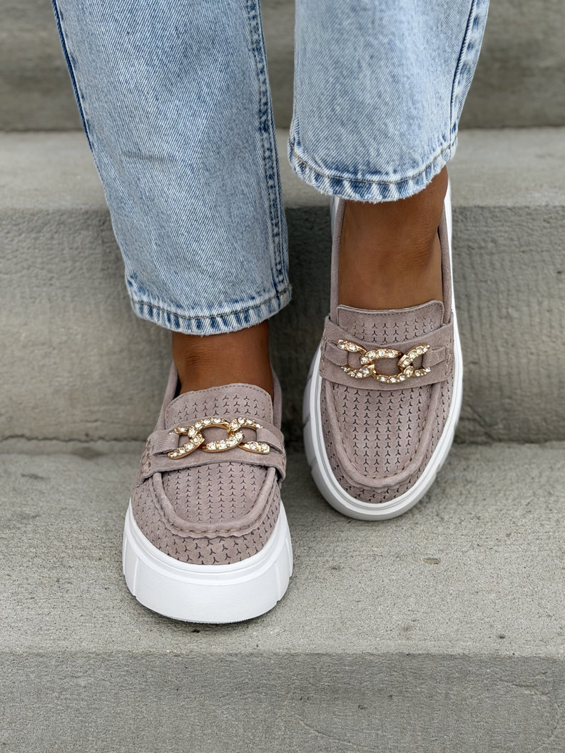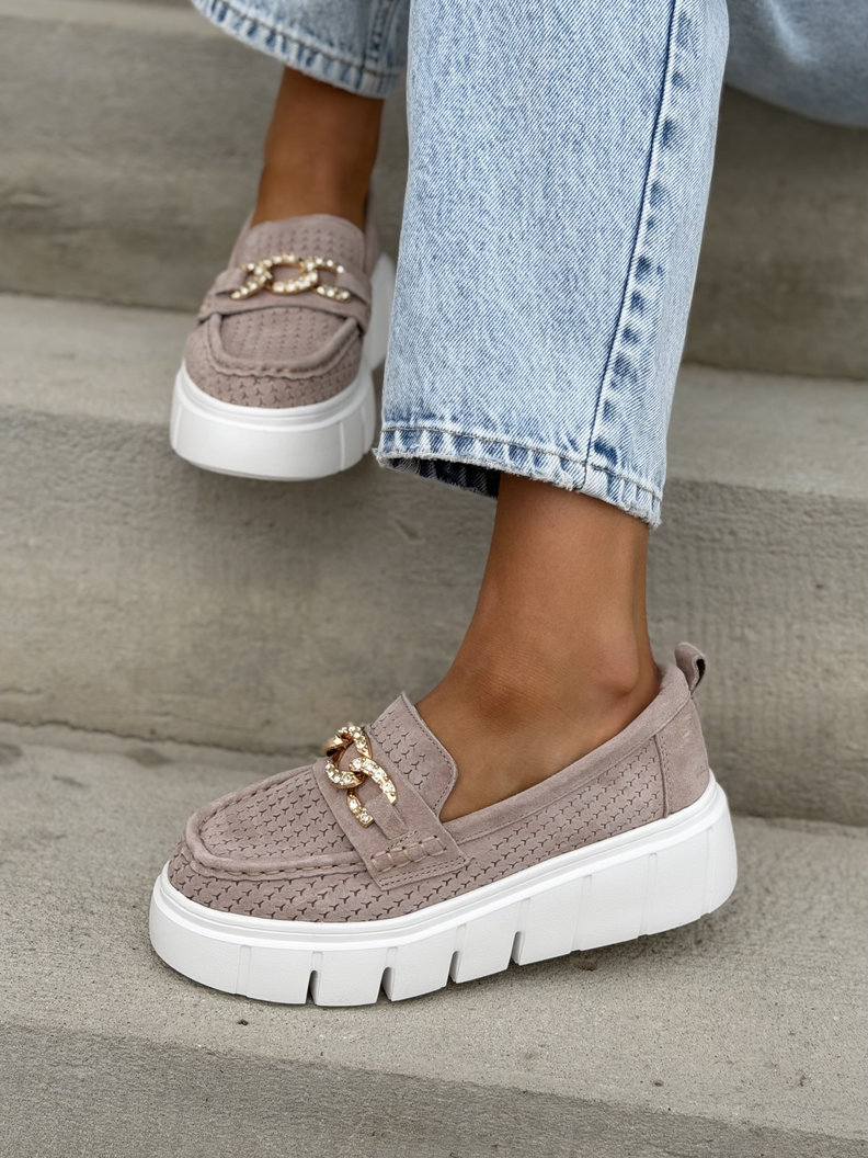Ultralekkie mokasyny na 4cm podeszwie, które wysmuklają sylwetkę i optycznie wydłużają nogi. Naturalna skóra oraz oddychająca, ażurowana cholewka zapewniają komfort przez cały dzień, a złota ozdoba dodaje eleganckiego, kobiecego charakteru. Świetnie wyglądają zarówno do garnituru, jeansów, lnianych spodni, jak i letnich szortów czy sukienek.