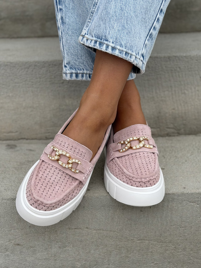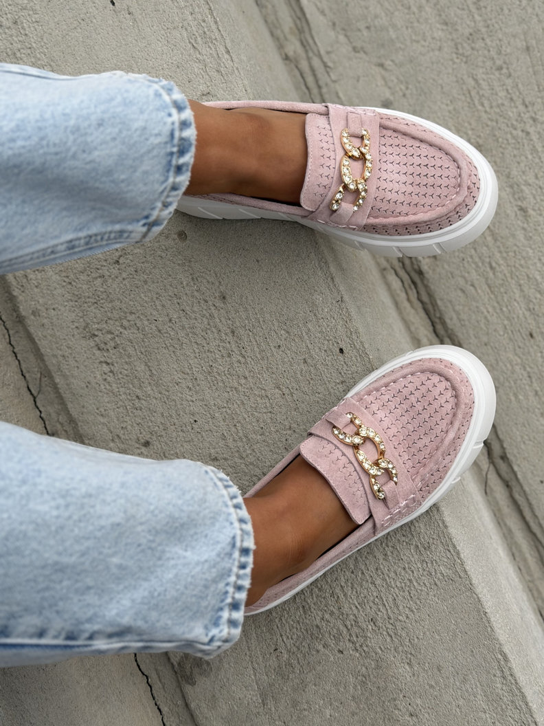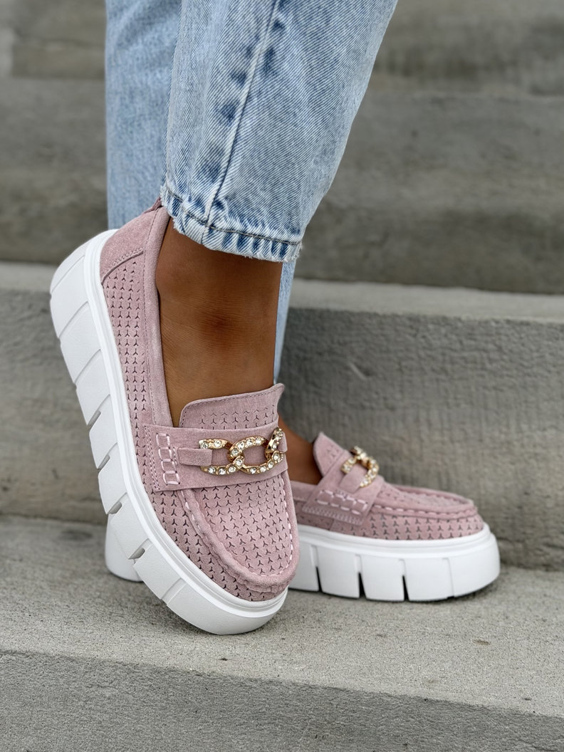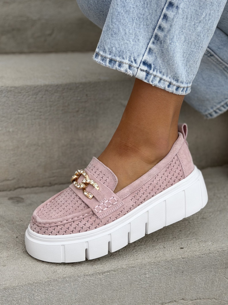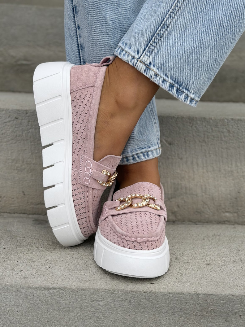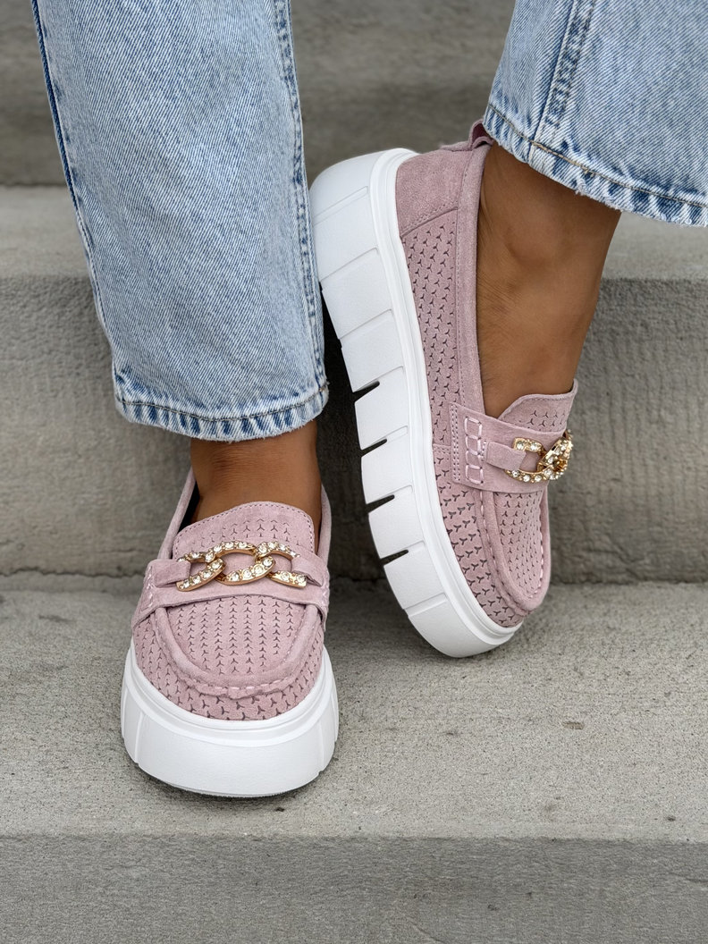 Ultralekkie mokasyny na 4cm podeszwie, które wysmuklają sylwetkę i optycznie wydłużają nogi. Naturalna skóra oraz oddychająca, ażurowana cholewka zapewniają komfort przez cały dzień, a złota ozdoba dodaje eleganckiego, kobiecego charakteru. Świetnie wyglądają zarówno do garnituru, jeansów, lnianych spodni, jak i letnich szortów czy sukienek.