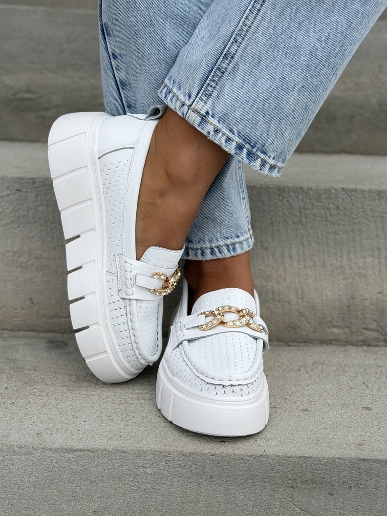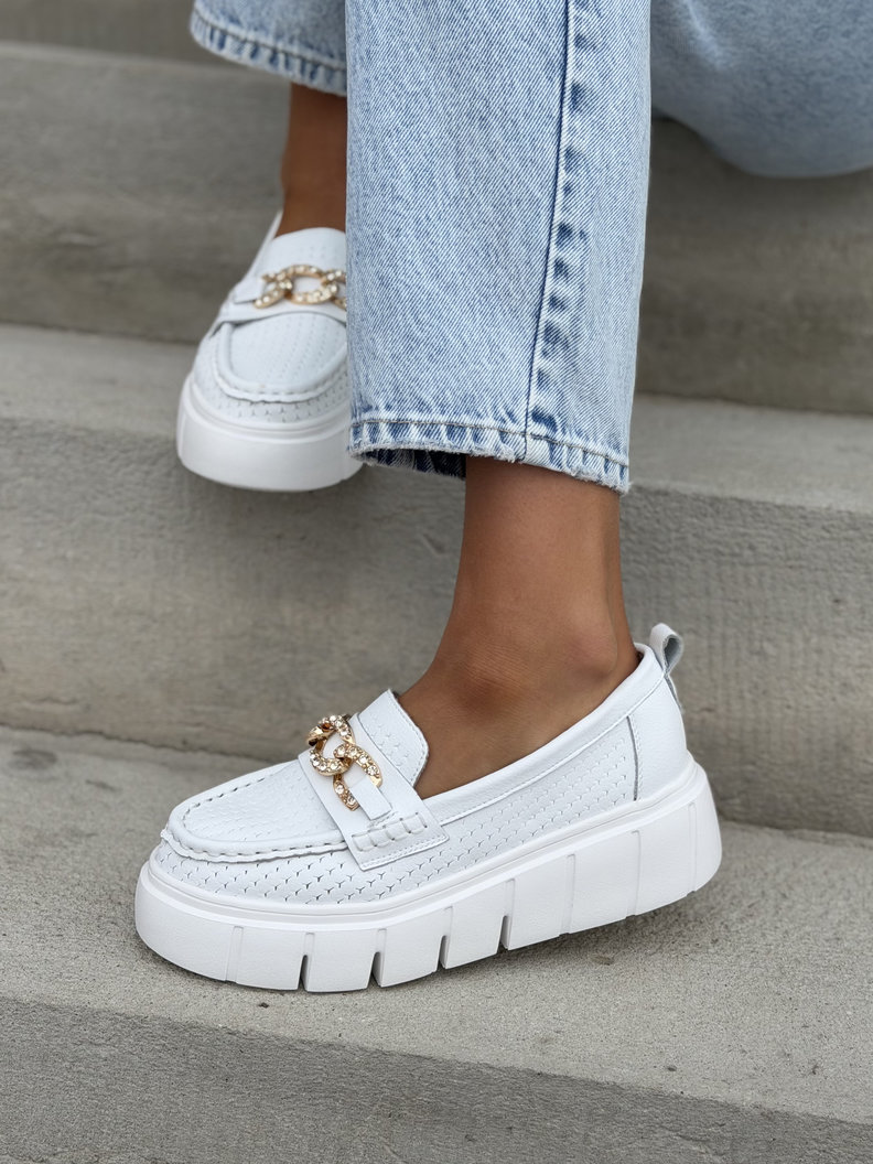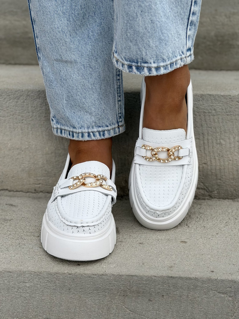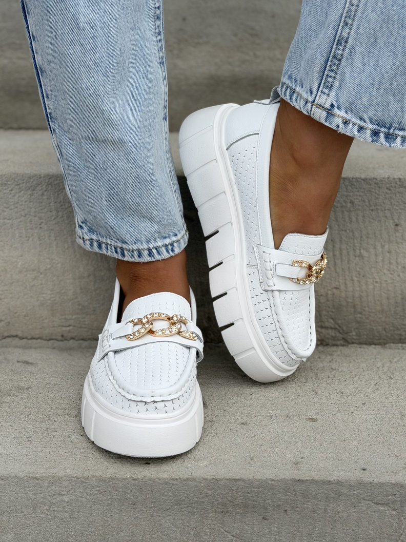 Ultralekkie mokasyny na 4cm podeszwie, które wysmuklają sylwetkę i optycznie wydłużają nogi. Naturalna skóra oraz oddychająca, ażurowana cholewka zapewniają komfort przez cały dzień, a złota ozdoba dodaje eleganckiego, kobiecego charakteru. Świetnie wyglądają zarówno do garnituru, jeansów, lnianych spodni, jak i letnich szortów czy sukienek.