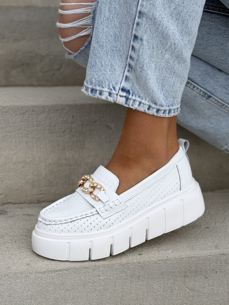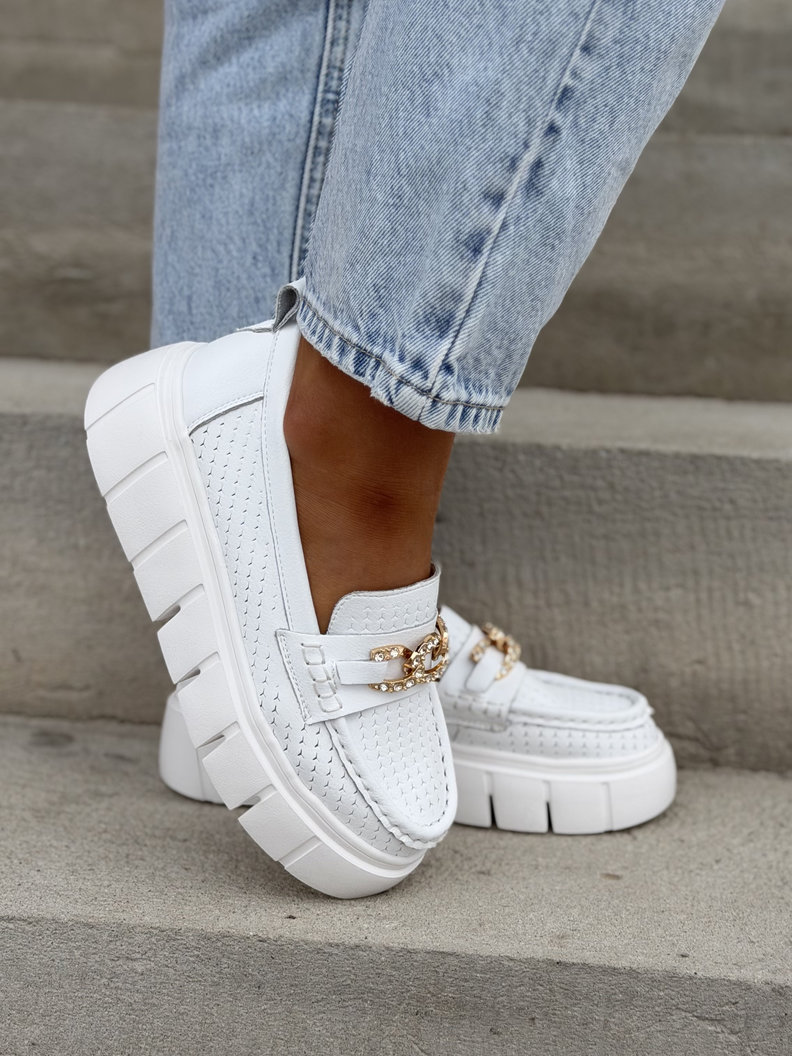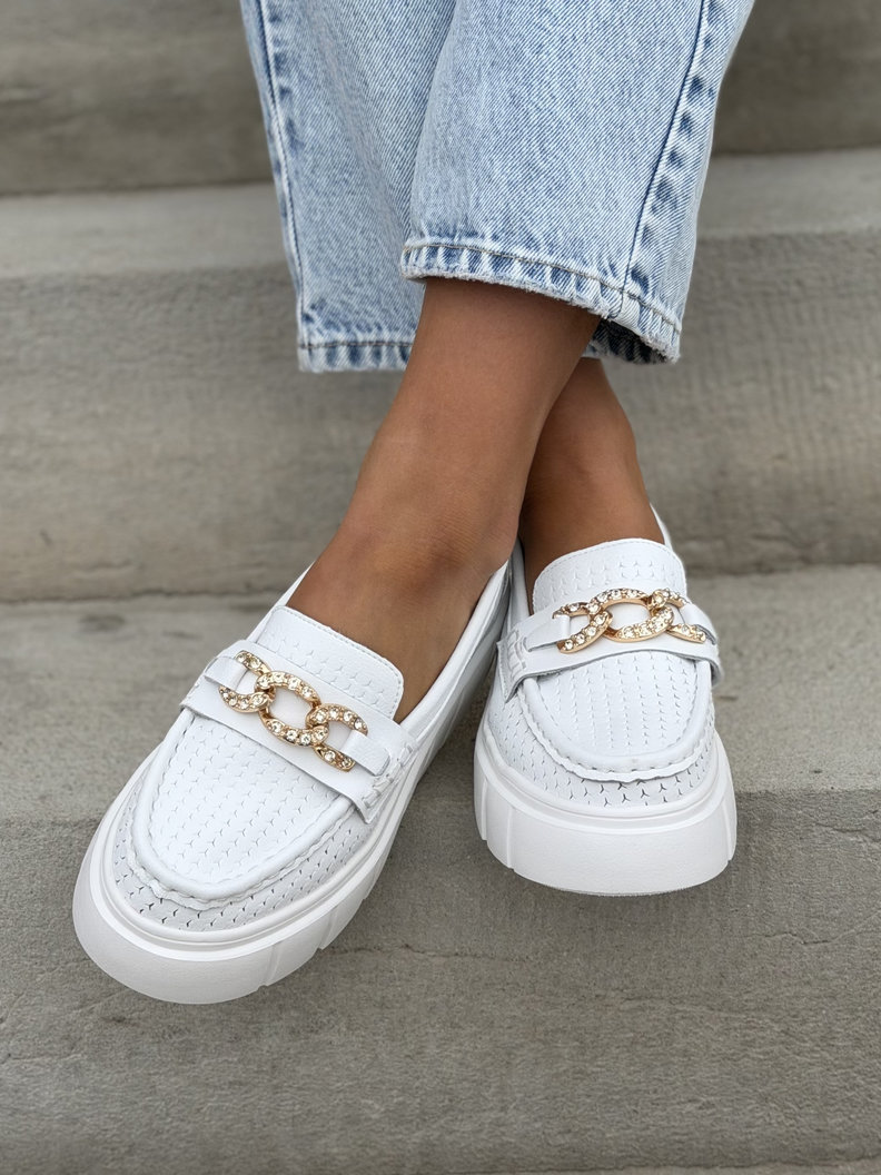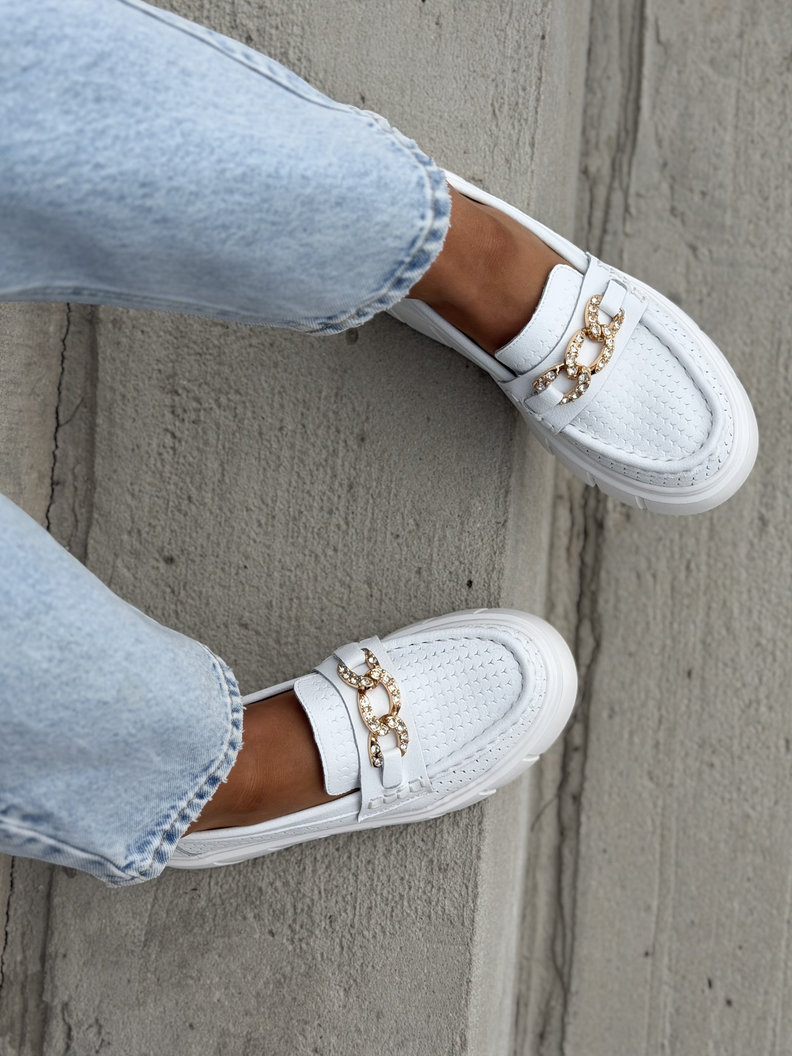 Ultralekkie mokasyny na 4cm podeszwie, które wysmuklają sylwetkę i optycznie wydłużają nogi. Naturalna skóra oraz oddychająca, ażurowana cholewka zapewniają komfort przez cały dzień, a złota ozdoba dodaje eleganckiego, kobiecego charakteru. Świetnie wyglądają zarówno do garnituru, jeansów, lnianych spodni, jak i letnich szortów czy sukienek.