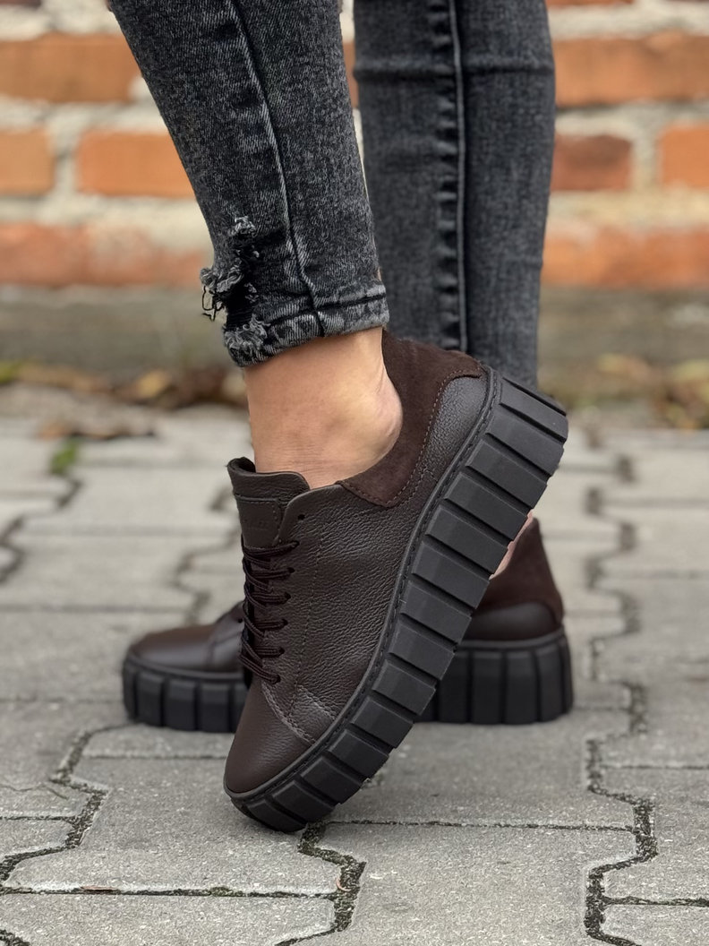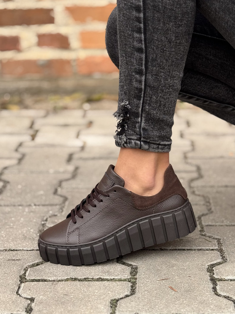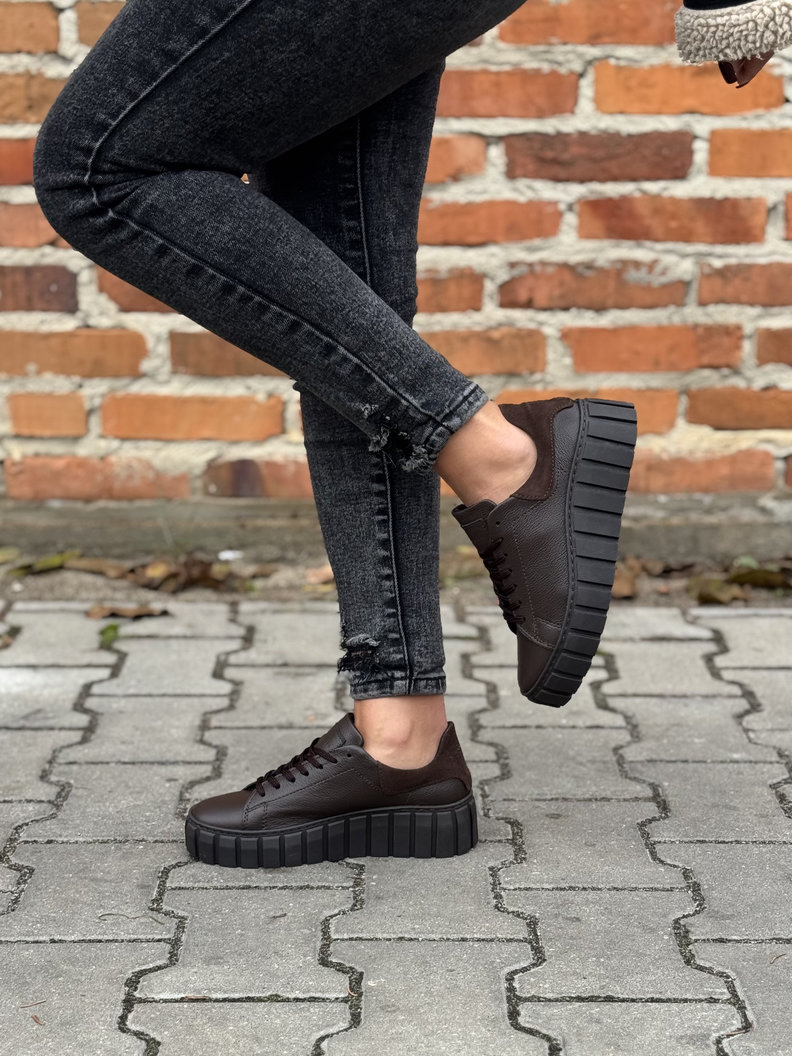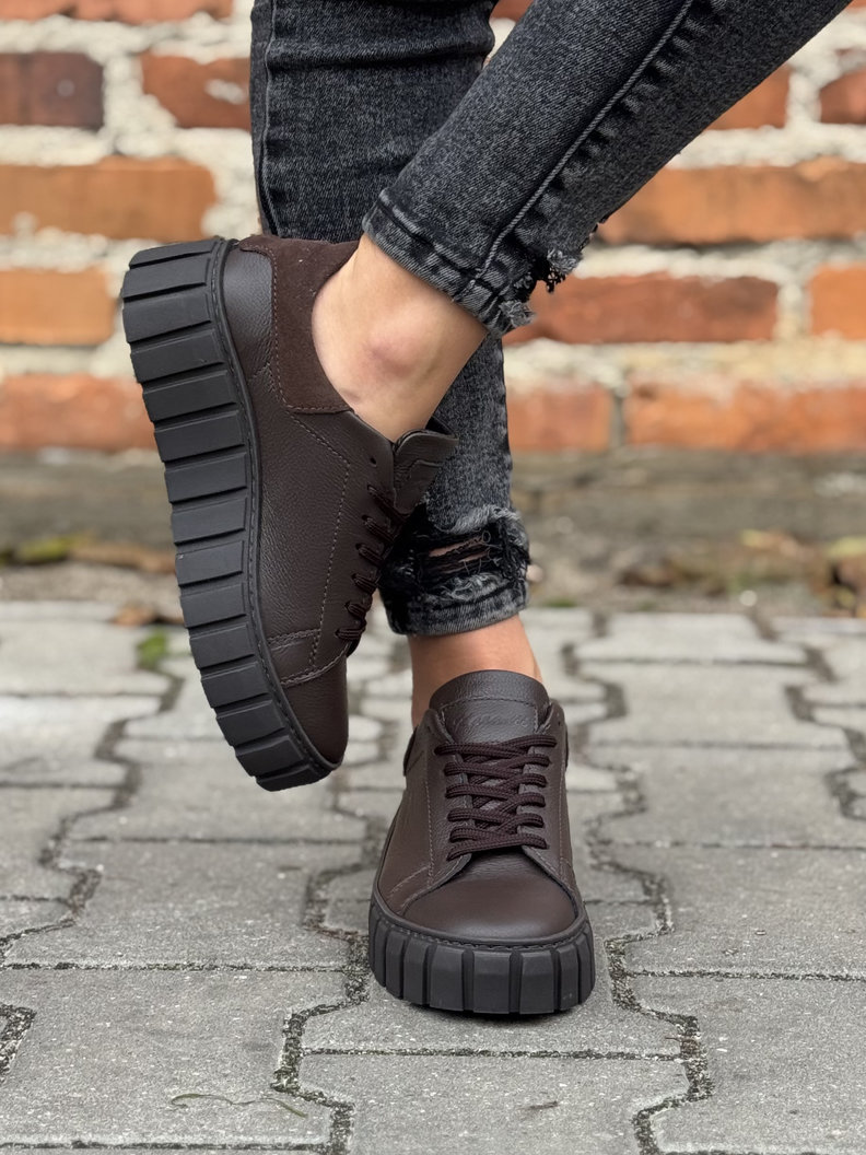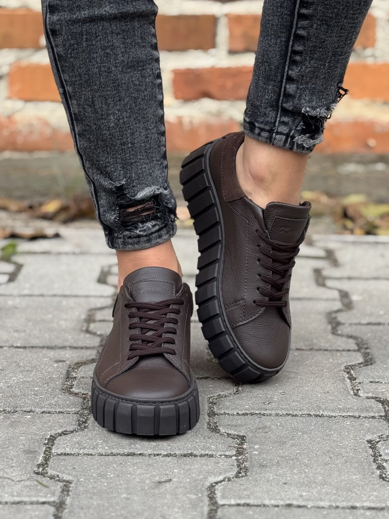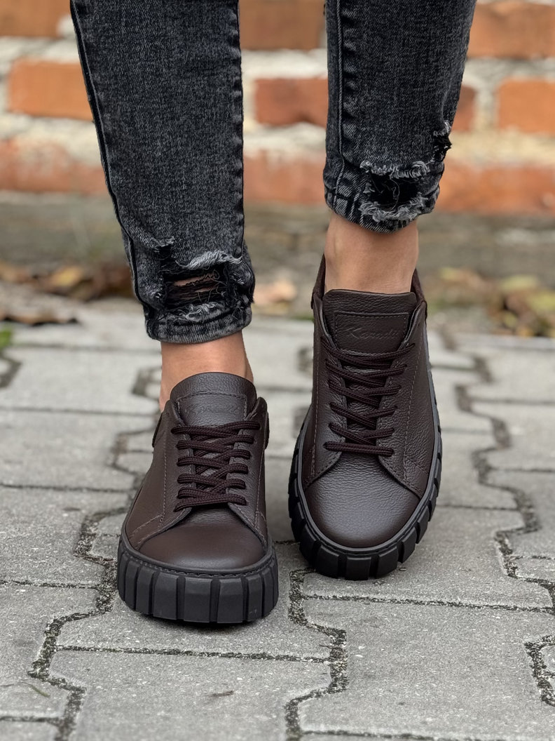 Trampki polskiej marki KAZADII z włoskiej skóry naturalnej w modnym odcieniu czekoladowego brązu. Niezwykle lekkie, miękkie i oddychające, gwarantują komfort nawet przez cały dzień. Osadzone na lekkiej, bieżnikowanej podeszwie, która zapewnia świetną przyczepność i subtelnie wysmukla sylwetkę. Idealne do codziennych stylizacji.