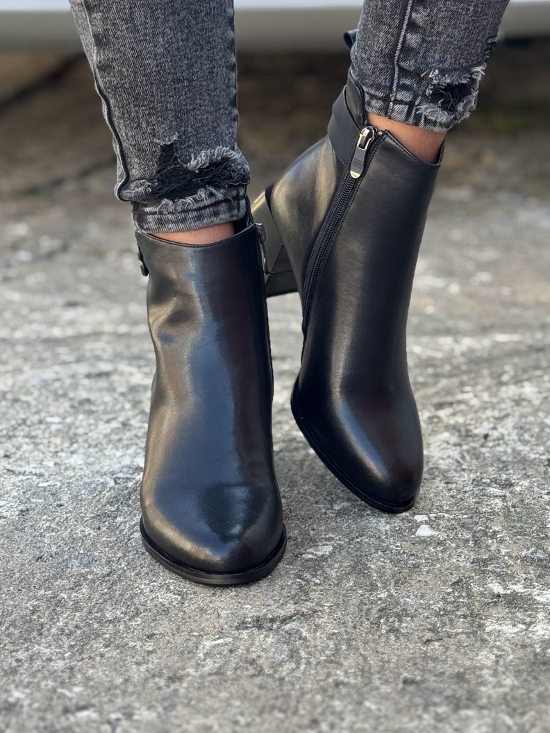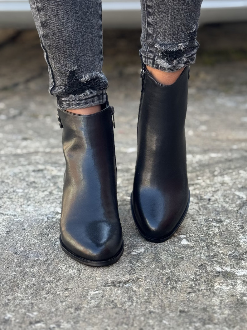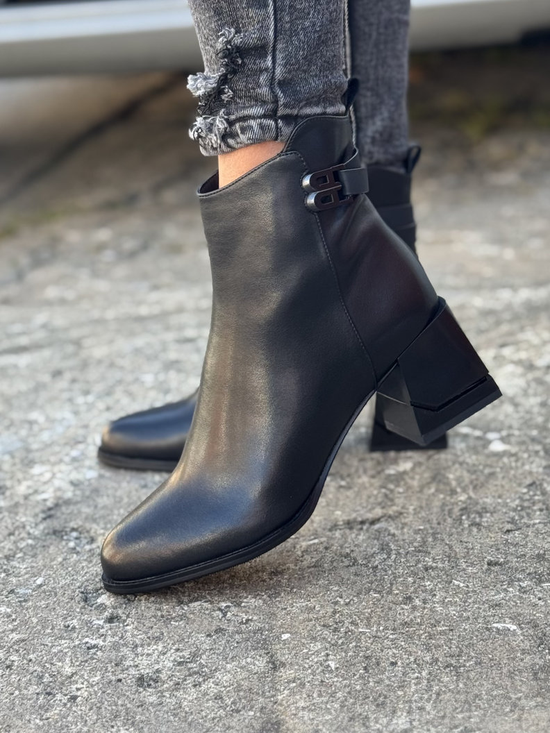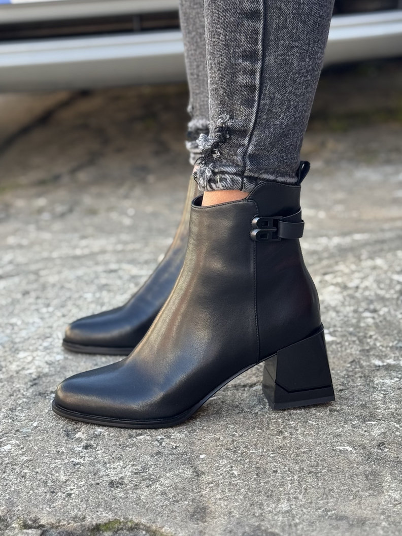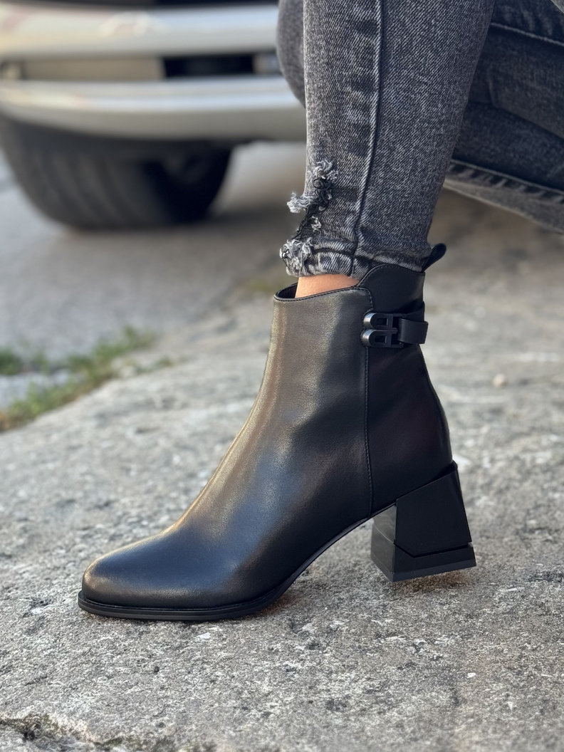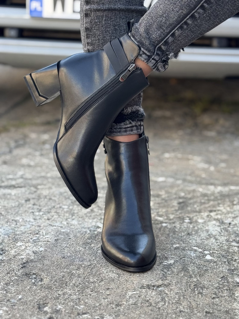 Stylowe botki damskie na słupku, wykonane ze skóry naturalnej z ociepleniem wewnątrz kocem obuwniczym. Stabilny 5,5 cm obcas gwarantuje wygodę i pewny krok. Idealne do sukienek, spódnic i eleganckich spodni – must-have na jesień i zimę.