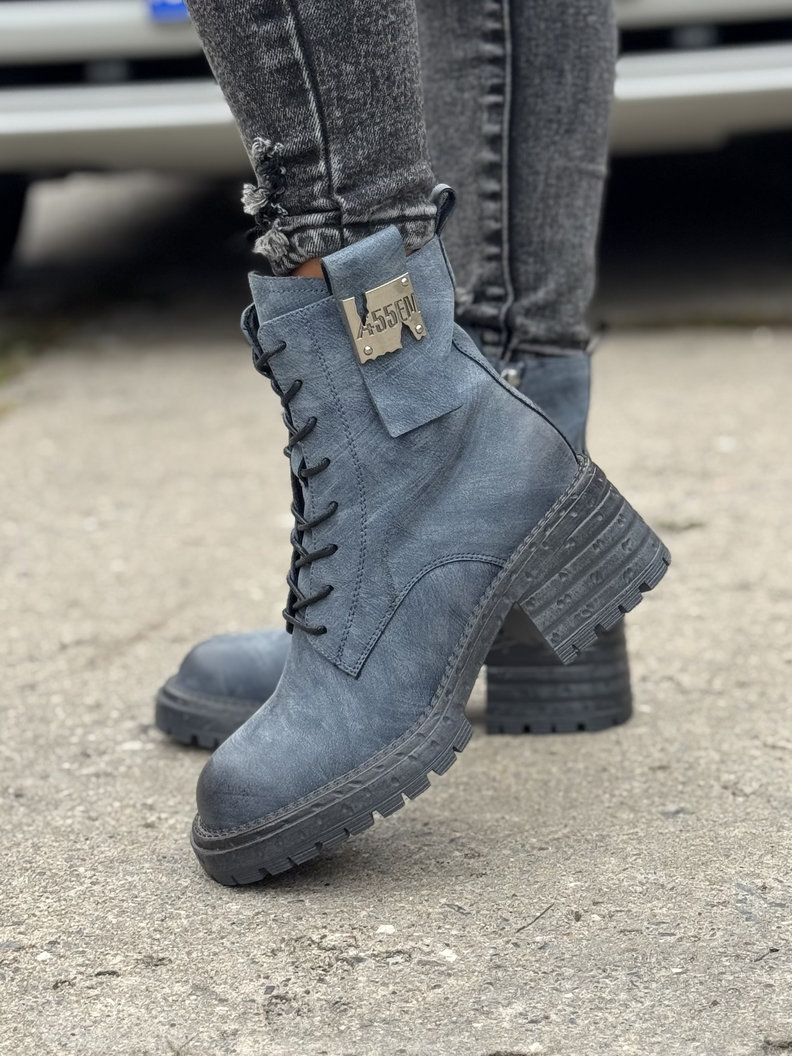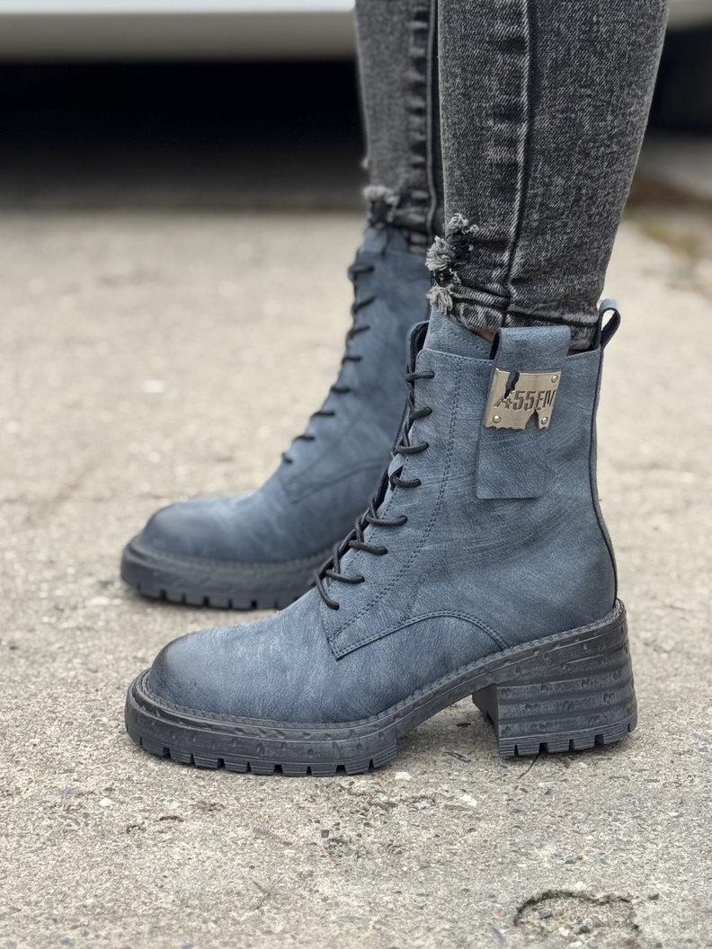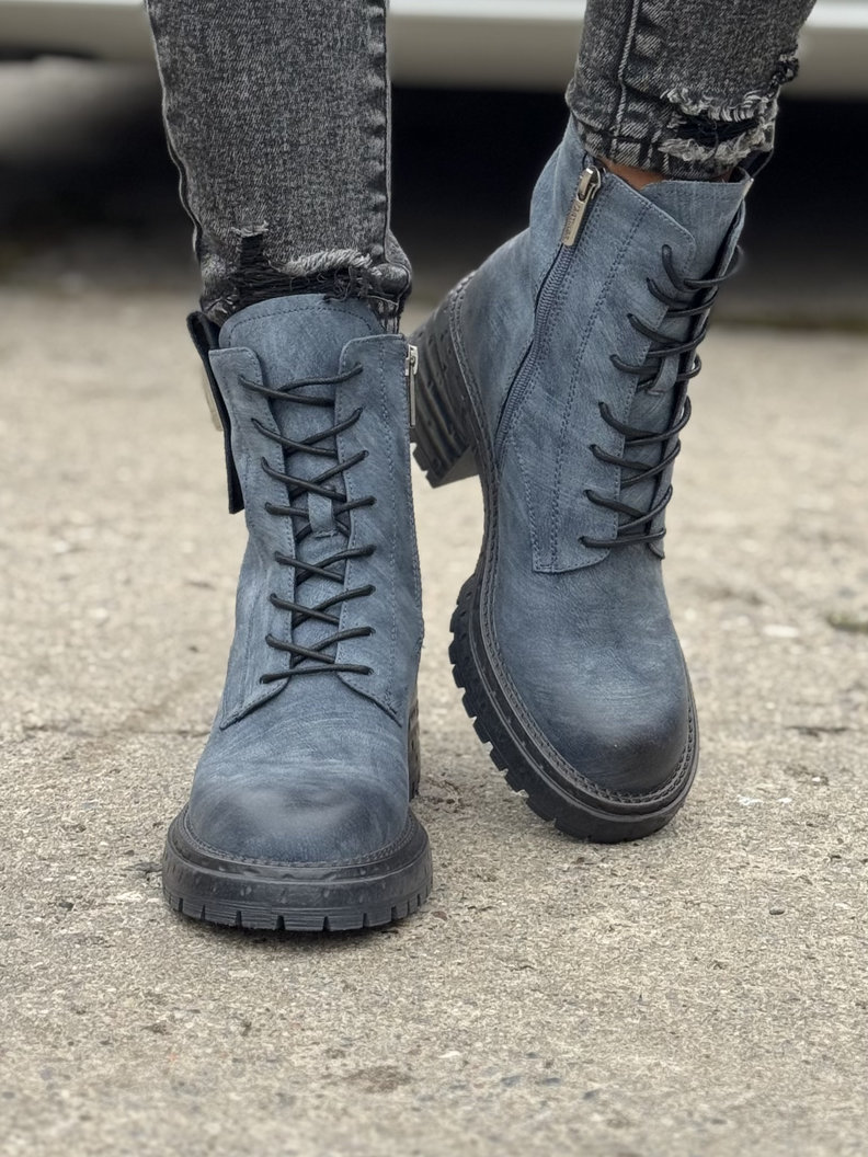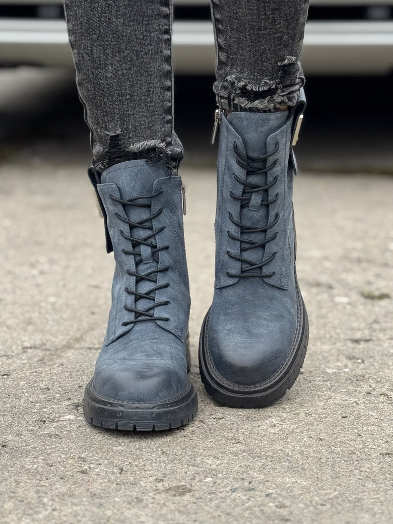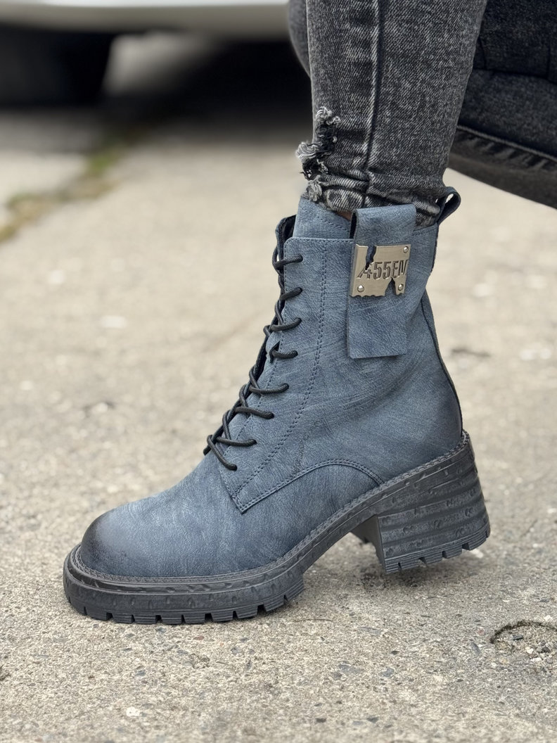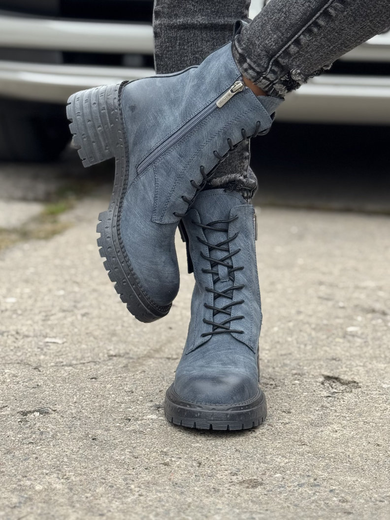 Ocieplane botki TENRA NAVY BLUE na traperkowej podeszwie skóra naturalna
