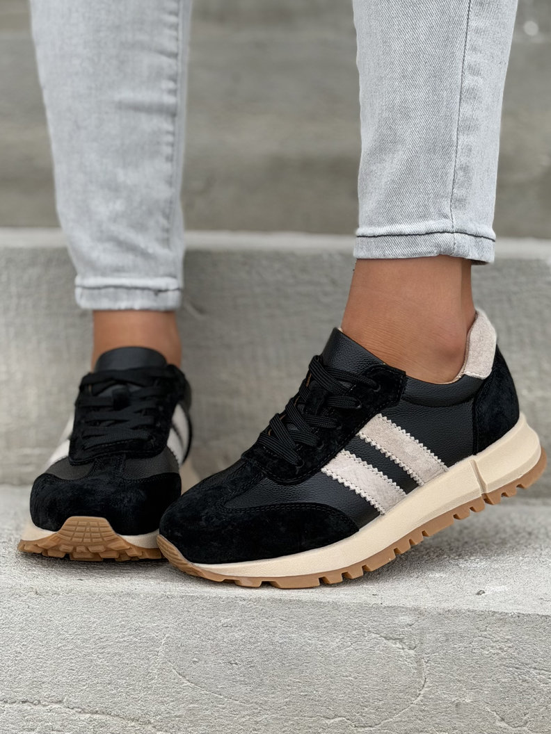Stylowe sneakersy damskie wykonane z naturalnej skóry zamszowej to idealny wybór na lato i codzienne stylizacje. Skórzana wkładka oraz oddychające wnętrze z ekologicznej dzianiny zapewniają komfort noszenia przez cały dzień. Lekka, antypoślizgowa podeszwa o wysokości ok. 2,5 cm gwarantuje wygodę i stabilność. Modne sneakersy, które świetnie pasują do jeansów, sukienek i letnich outfitów.