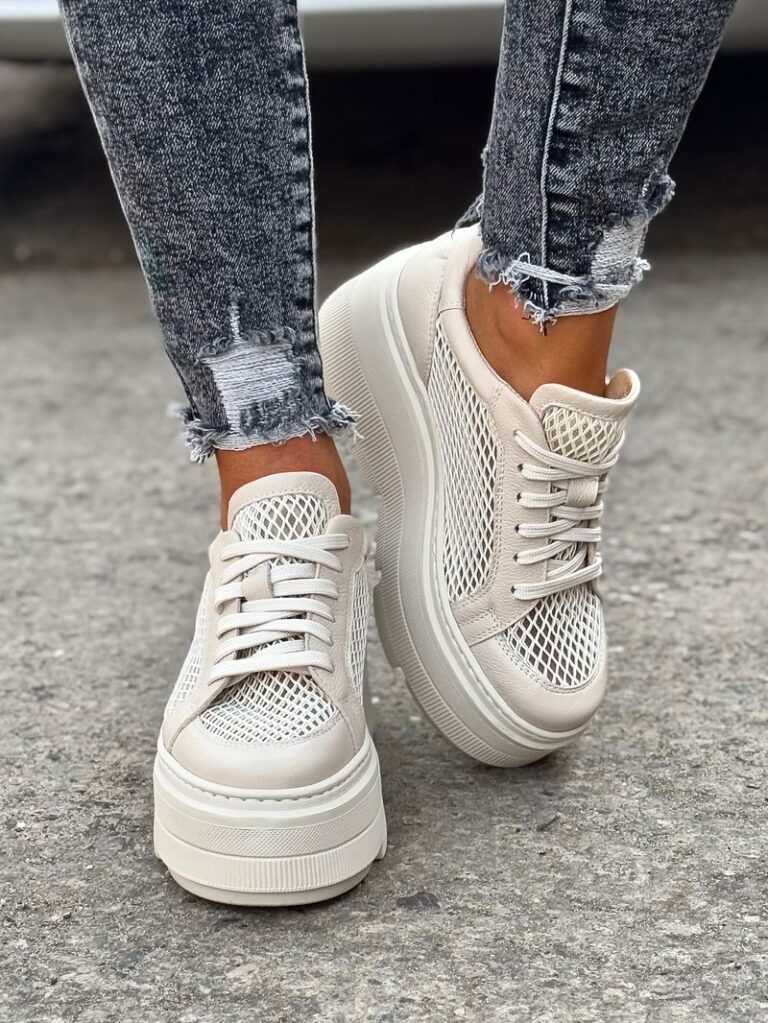 Trampki stworzone dla kobiet, które kochają łączyć modny wygląd z komfortem. Dzięki ultralekkiej konstrukcji i przewiewnej siatce(najmodniejszej w tym sezonie), Twoje stopy pozostaną świeże przez cały dzień, a podwyższona podeszwa subtelnie wydłuży nogi, dodając Ci pewności siebie. Idealne na letnie spacery, miejskie przygody i każdą okazję, kiedy chcesz wyglądać stylowo bez rezygnacji z wygody.