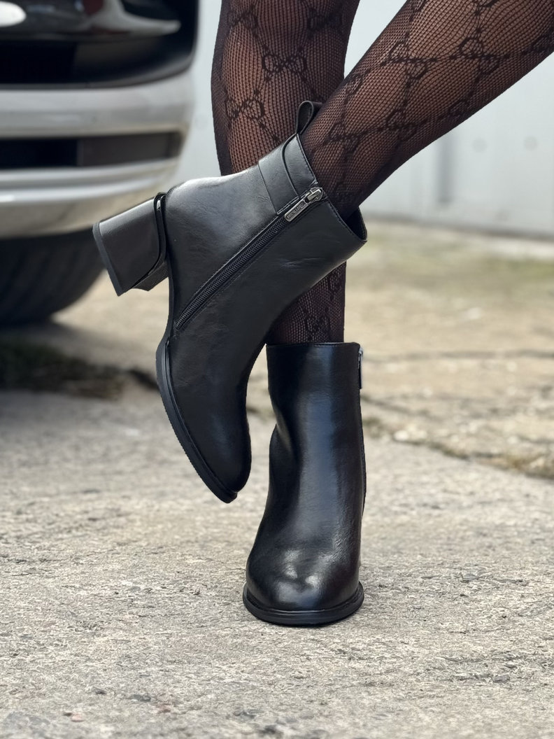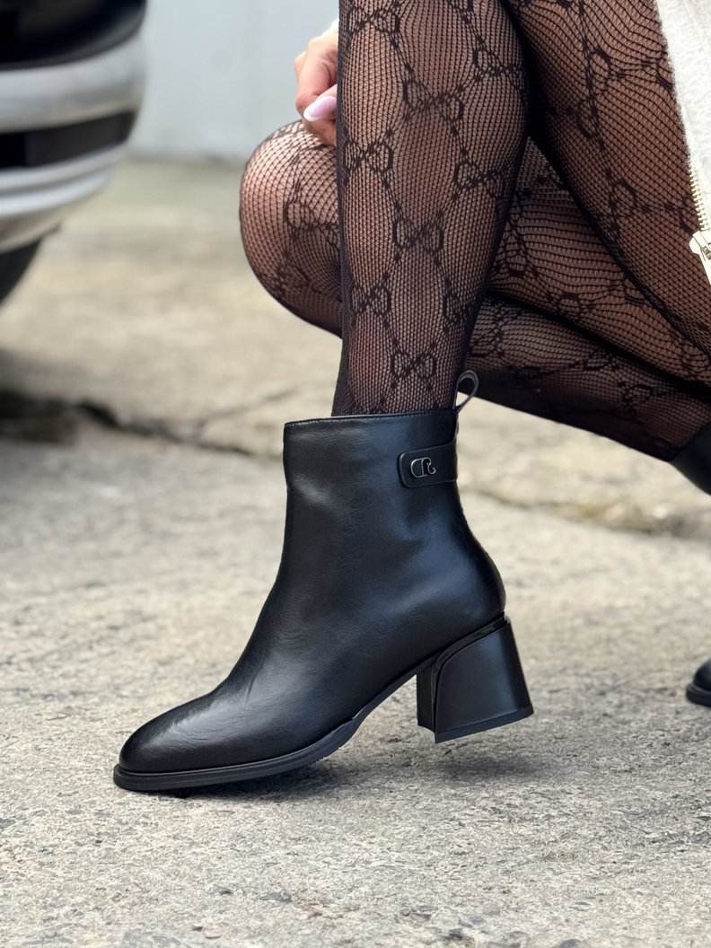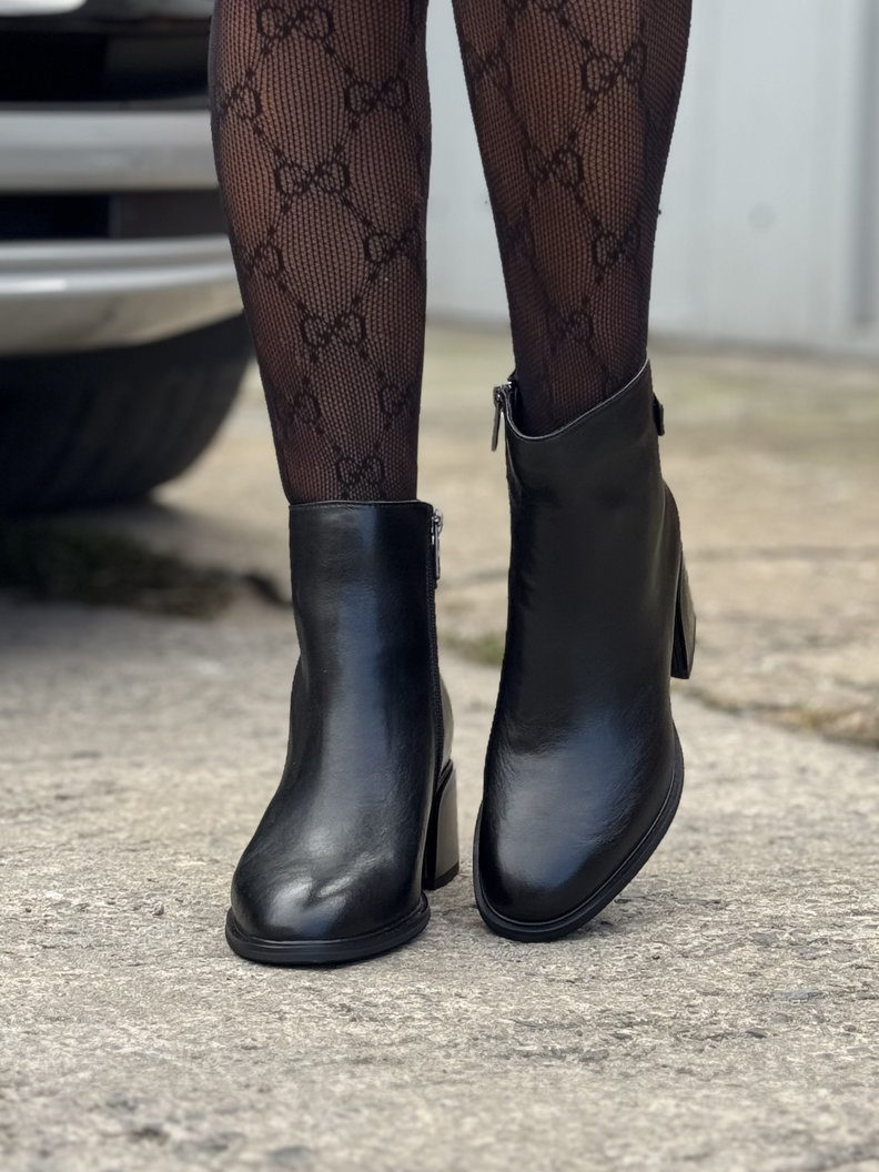 Stylowe botki damskie na słupku, wykonane ze skóry naturalnej z ociepleniem wewnątrz kocem obuwniczym. Stabilny 5,5 cm obcas gwarantuje wygodę i pewny krok. Idealne do sukienek, spódnic i eleganckich spodni – must-have na jesień i zimę.