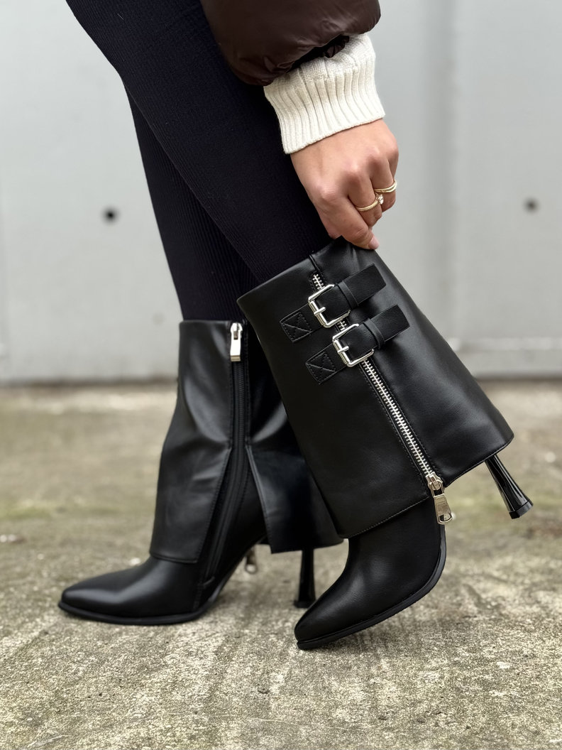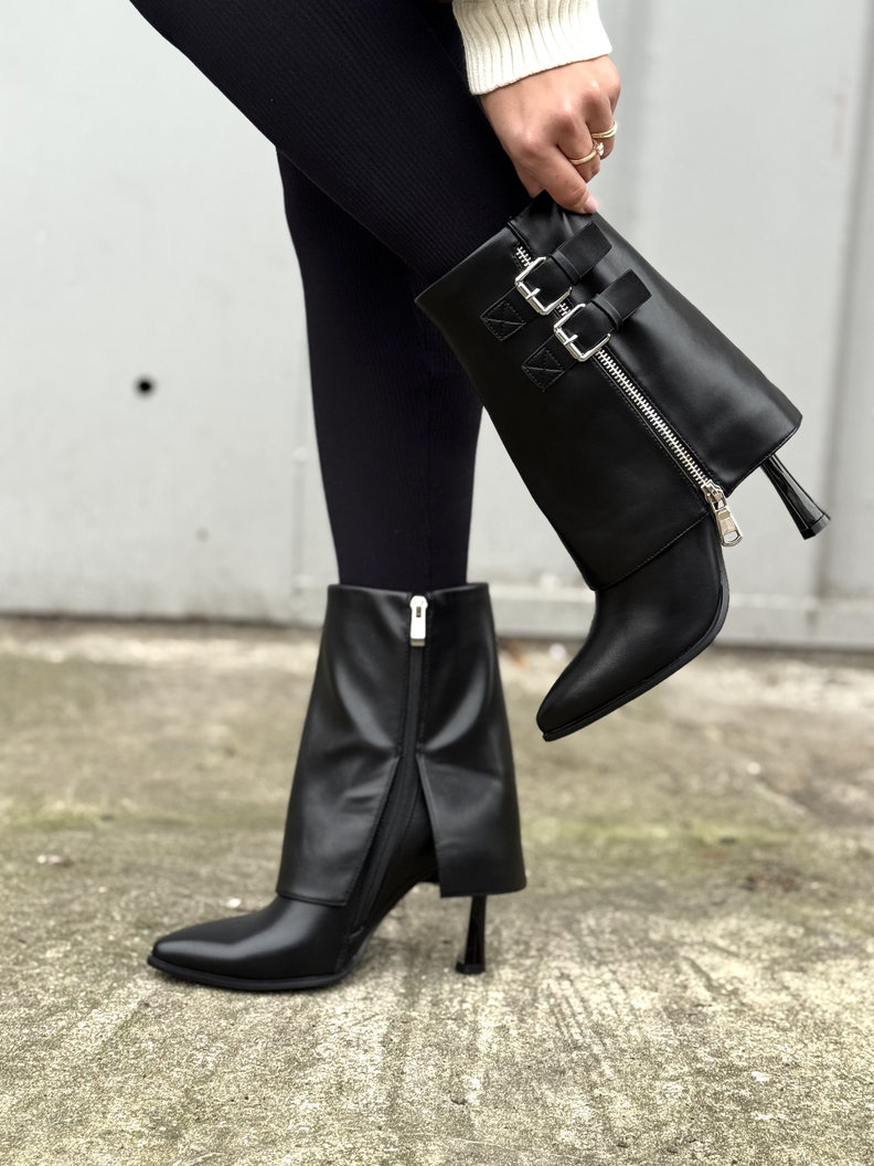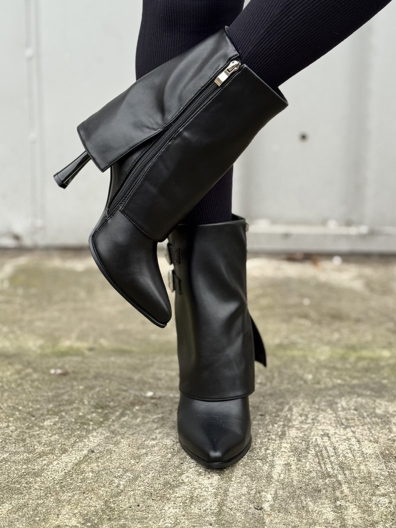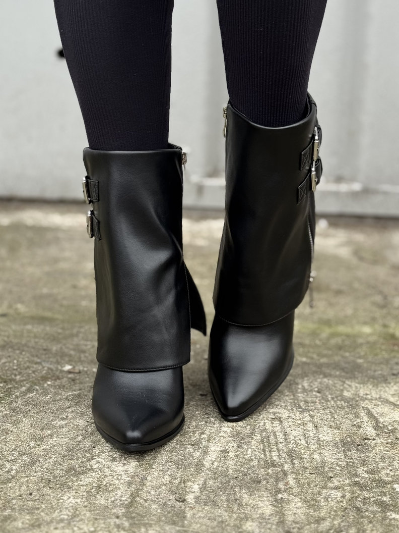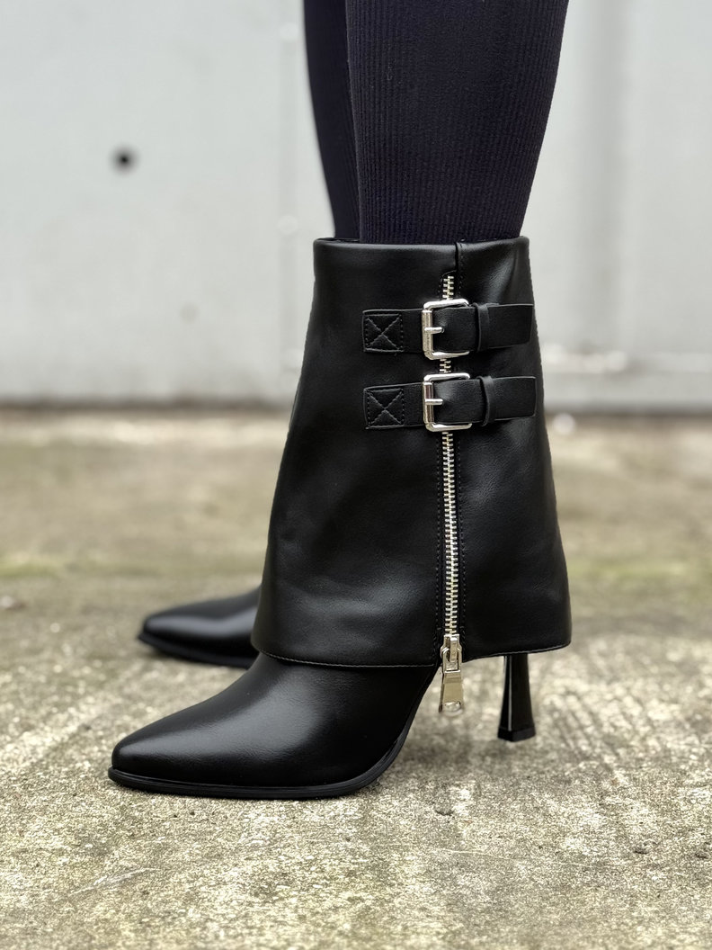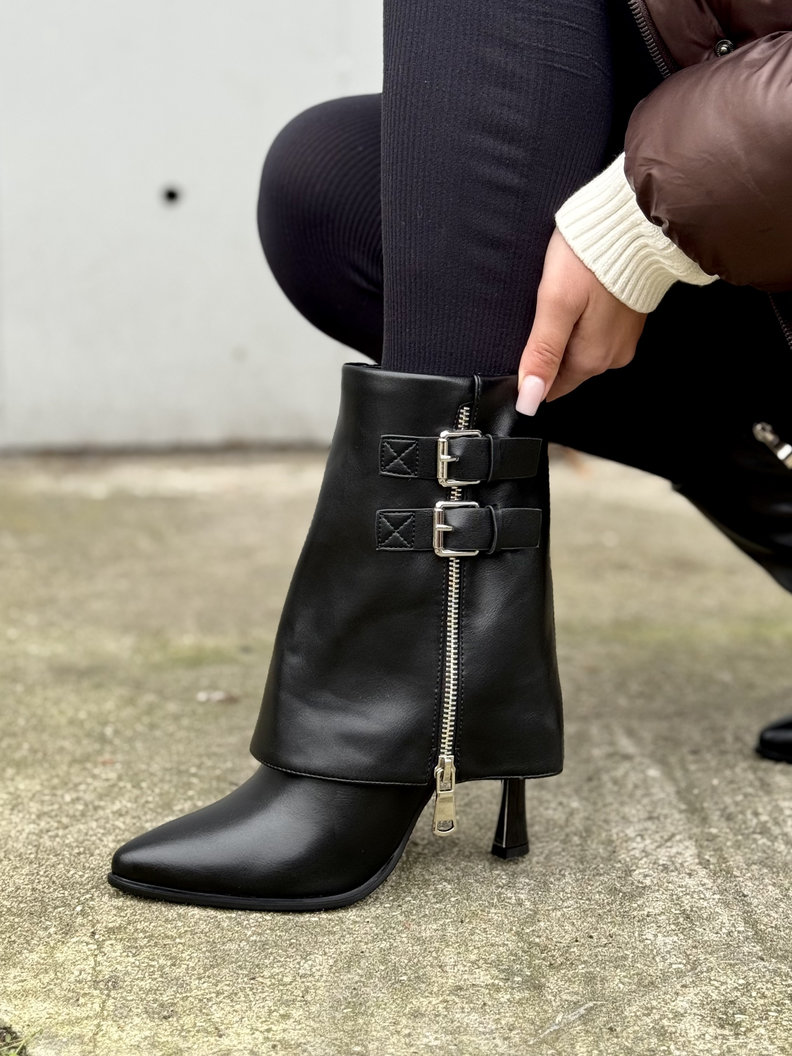 Stylowy model na stabilnym obcasie z ozdobnymi klamrami i suwakiem. Pięknie układają się na nodze, a smukły nosek dodaje elegancji. Idealne do codziennych stylizacji oraz wieczornych wyjść. Delikatnie ocieplane w środku kocem obuwniczym.