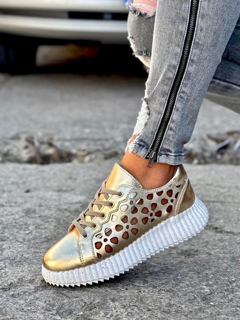 Ultralekkie trampki z naturalnej skóry (wewnątrz i na zewnątrz) z ażurową cholewką i białą podwyższoną podeszwą, która dodaje kilka centymetrów wzrostu. Nowoczesny design i niezrównany komfort – idealne na lato.