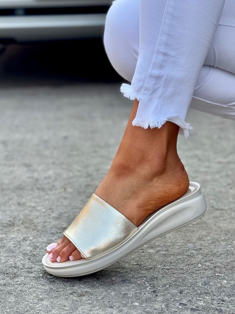 Złote klapki Celeste Gold od Kazadii to prawdziwa perełka w Twojej garderobie! Wykonane z naturalnej skóry zarówno wewnątrz, jak i na zewnątrz, te eleganckie klapki zapewnią Ci komfort przez cały dzień. Subtelna, beżowa podwyższona podeszwa doda 3 cm do wzrostu, jednocześnie wysmuklając sylwetkę.