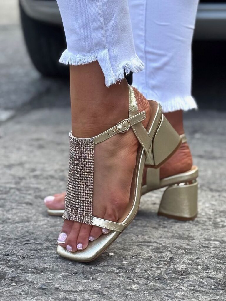 Olśniewający blask złotych sandałków z efektownym pasem z cyrkoniami na przodzie, które pięknie podkreślają stopę i dodają luksusowego charakteru każdej stylizacji. Stabilny obcas o wysokości 7,5 cm zapewnia wygodę przez cały wieczór – idealny wybór na wesele, randkę czy imprezę w klubie.