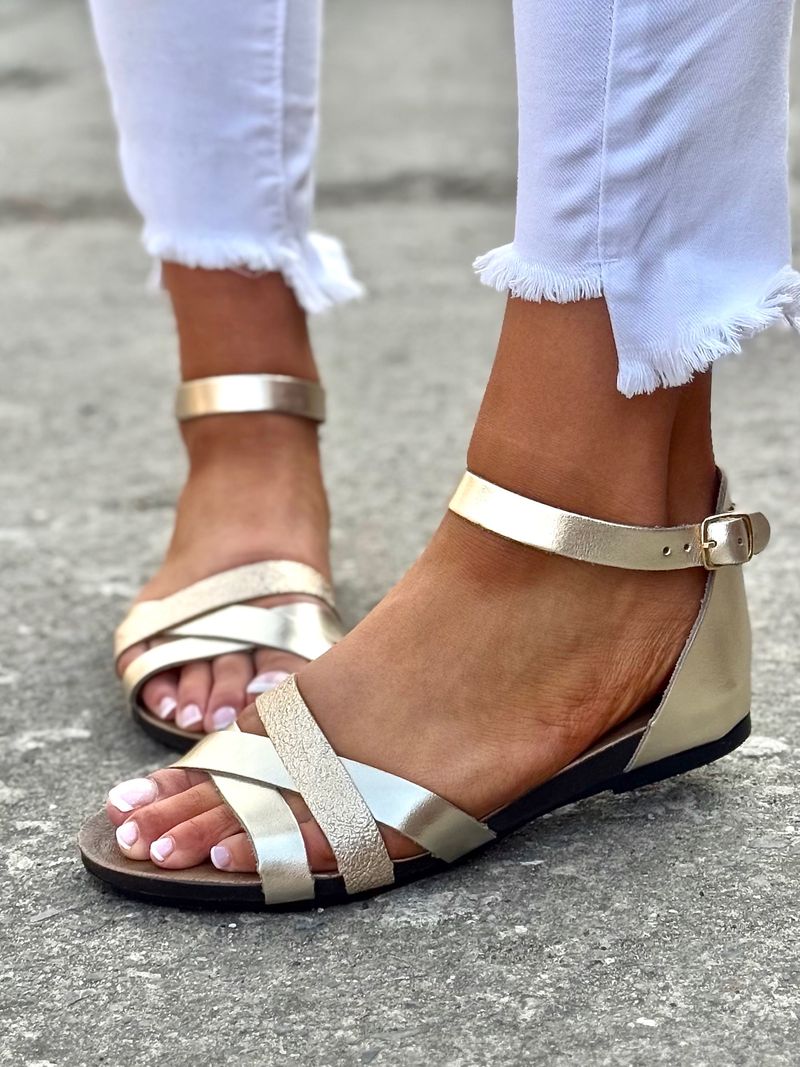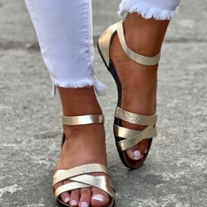 Wyjątkowy model sandałów, który łączy elegancję z codzienną wygodą. Wykonane z wysokiej jakości naturalnej skóry, zarówno na zewnątrz, jak i wewnątrz, gwarantują trwałość i komfort użytkowania przez cały dzień. Model wyposażono w regulowany pasek wokół kostki zapinany na klamerkę, co zapewnia idealne dopasowanie, a ozdobne złote paski na przodzie dodają im niepowtarzalnego blasku. Mega stabilna konstrukcja sprawia, że sandały te doskonale sprawdzą się zarówno w codziennych stylizacjach, jak i podczas wyjątkowych okazji.